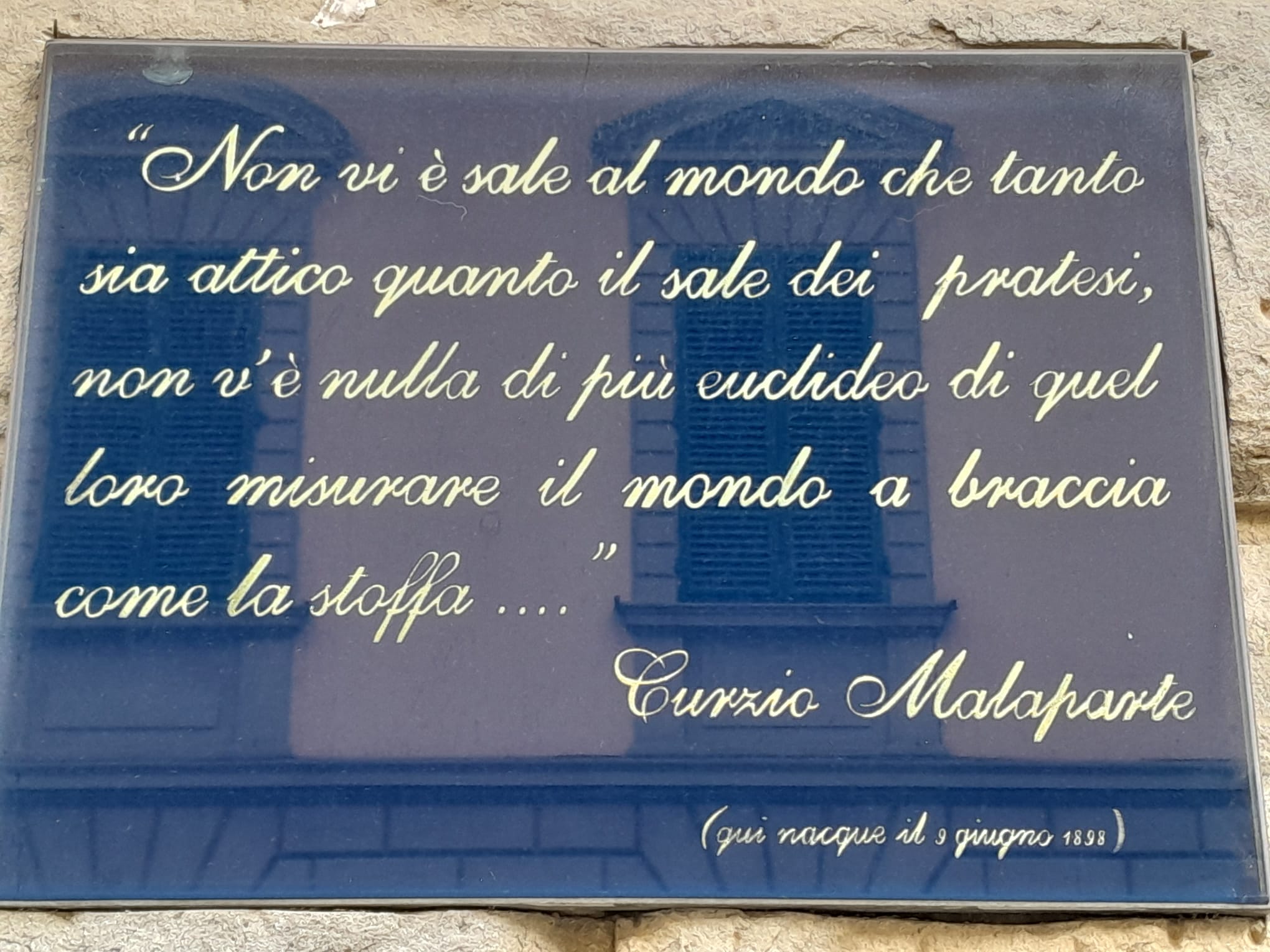 Contiene una citazione desueta dei pratesi firmata Malaparte e nell’ultima riga si legge che in quel palazzo nacque lo scrittore.