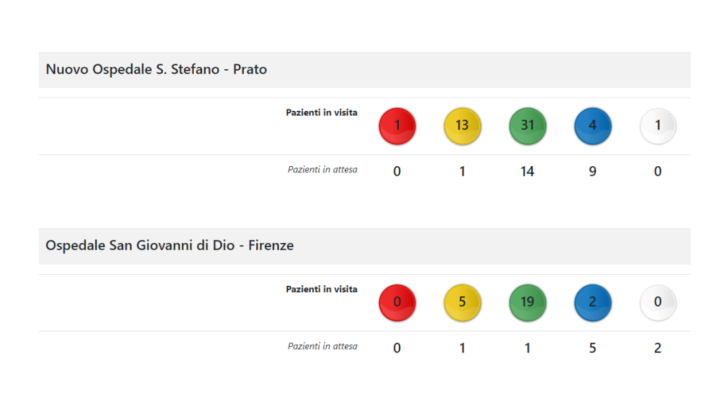 Basta cliccare sul link per sapere, in tempo reale, le presenze nelle otto strutture di Medicina d’Urgenza: dagli accessi in codice rosso fino a quelli in bianco il monitoraggio riguarda gli ospedali Santo Stefano di Prato, quelli dell’area pistoiese San Jacopo e Santi Cosma e Damiano; dell’area fiorentina Santa Maria Annunziata, Santa Maria Nuova, San Giovanni di Dio e Borgo San Lorenzo e il San Giuseppe di Empoli.