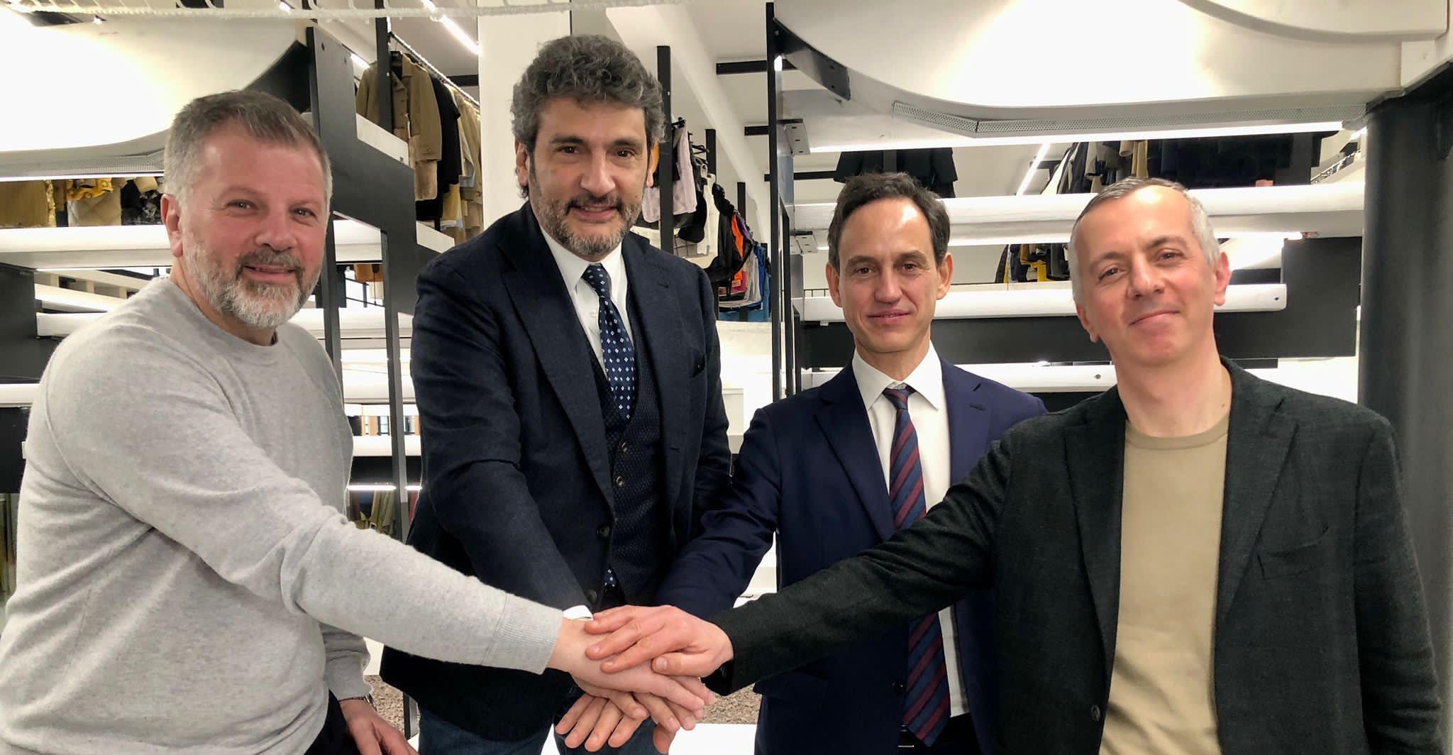 La stipula dell’accordo del 2023 fra Beste e Holding Moda: Giovanni Santi e Matteo Santi con Claudio Rovere e Giulio Guasco