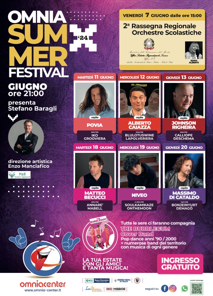 Dopo la rassegna musicale dei ragazzi prenderà il via l’Omnia Summer festival il cui direttore artistico è Enzo Manciafico, mentre la conduzione è stata affidata a Stefano Baragli. Ecco gli eventi in programma