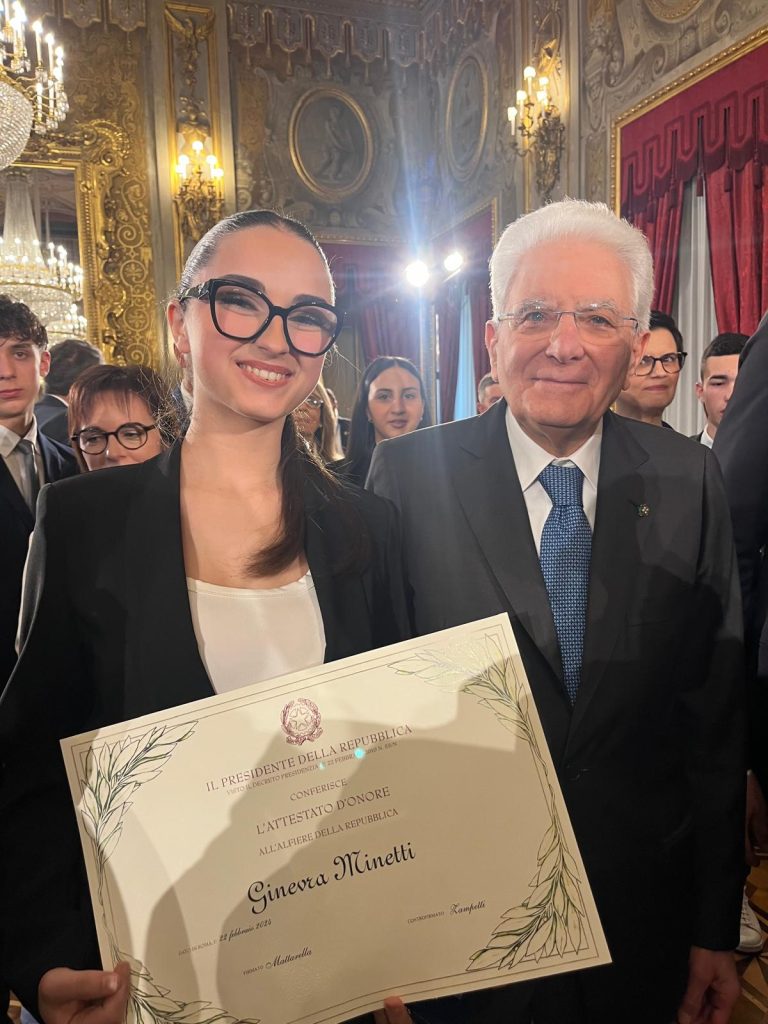 “Per l’entusiasmo e la generosità con cui presta la sua opera di volontaria. Durante la recente alluvione di Prato ha preso parte alla ricerca di alcune persone disperse e si è dedicata senza sosta all’accoglienza dei tanti sfollati ai quali non ha mai fatto mancare un sorriso rassicurante”. E’ questa la motivazione con la quale il Presidente della Repubblica Sergio Mattarella, ha conferito alla diciassettenne montemurlese Ginevra Minetti, volontaria della Misericordia, l’attestato d’onore di Alfiere della Repubblica. Il presidente ha consegnato questa mattina al Quirinale gli attestati ai 29 alfieri designati. Oltre ai genitori di Ginevra, alla cerimonia era presente anche il sindaco del Comune di Montemurlo Simone Calamai, che ha avuto la possibilità di parlare con il presidente della Repubblica Sergio Mattarella. Calamai ha fatto presente la situazione ancora complessa di Montemurlo e delle altre zone alluvionate della Toscana. Il sindaco ha chiesto al presidente attenzione ed un interessamento affinché possano arrivare in tempi rapidi i risarcimenti dello Stato per famiglie e imprese che hanno subito gravi danni a seguito dell’alluvione del 2 novembre scorso. Insieme al sindaco di Montemurlo c’era anche il sindaco di Campi Bisenzio ed entrambi hanno rivolto l’invito al presidente Mattarella a venire a visitare i territori colpiti.