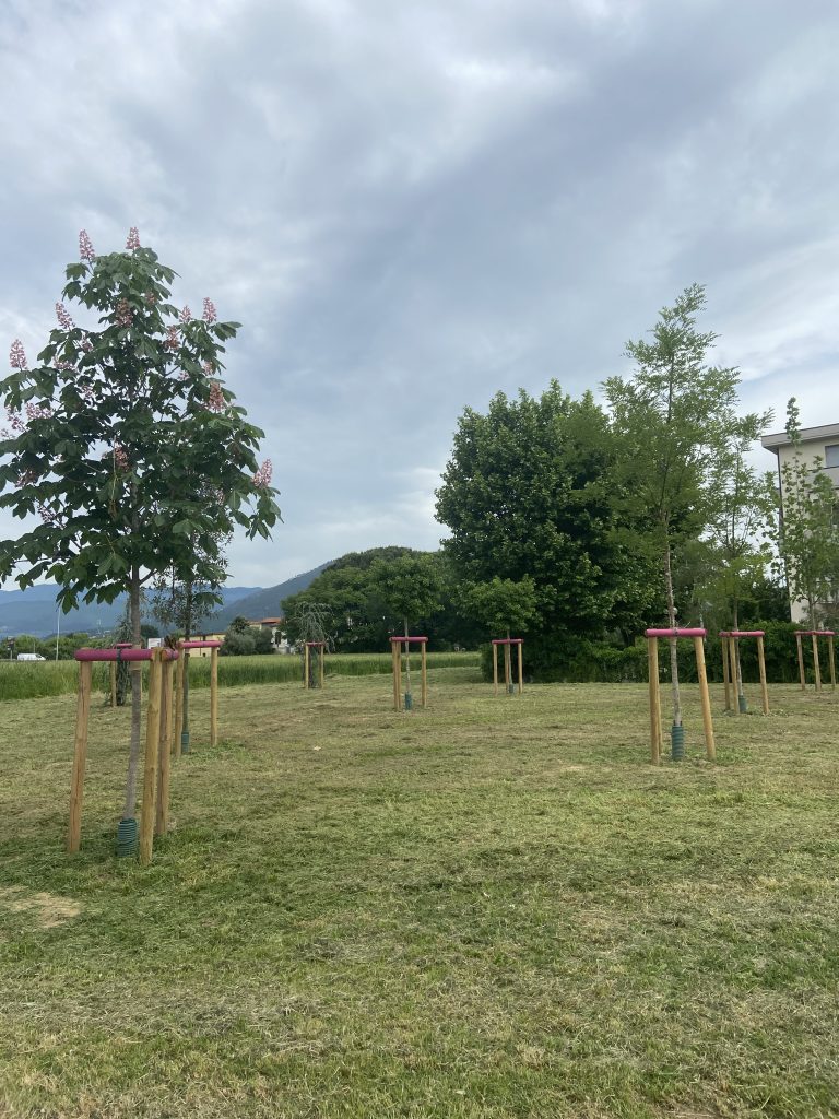 L’area è di circa 1.300 mq posta all’incrocio tra il piazzale e una viabilità di quartiere e delimitata a nord ed est da verde pubblico di previsione e alcuni edifici residenziali. Il verde pubblico si presenta sostanzialmente incolto e senza alberature. Il Piano operativo prevede la realizzazione di un percorso di connessione pertanto il progetto pur non realizzando il percorso prevede la messa a dimora delle piante in modo tale da lasciare la la possibilità di farlo in un secondo momento quando anche l’area alle spalle sarà in disponibilità dell’Amministrazione. Al fine di mitigare le alte temperature rilevate e la presenza di concentrazioni di particolato, il progetto prevede la messa a dimora di 19 alberature che vanno a creare un polmone verde a servizio della zona introducendo specie arboree di diverse specie al fine di favorire la biodiversità, oltre ad inserire note di colore grazie alle fioriture e al fogliame.