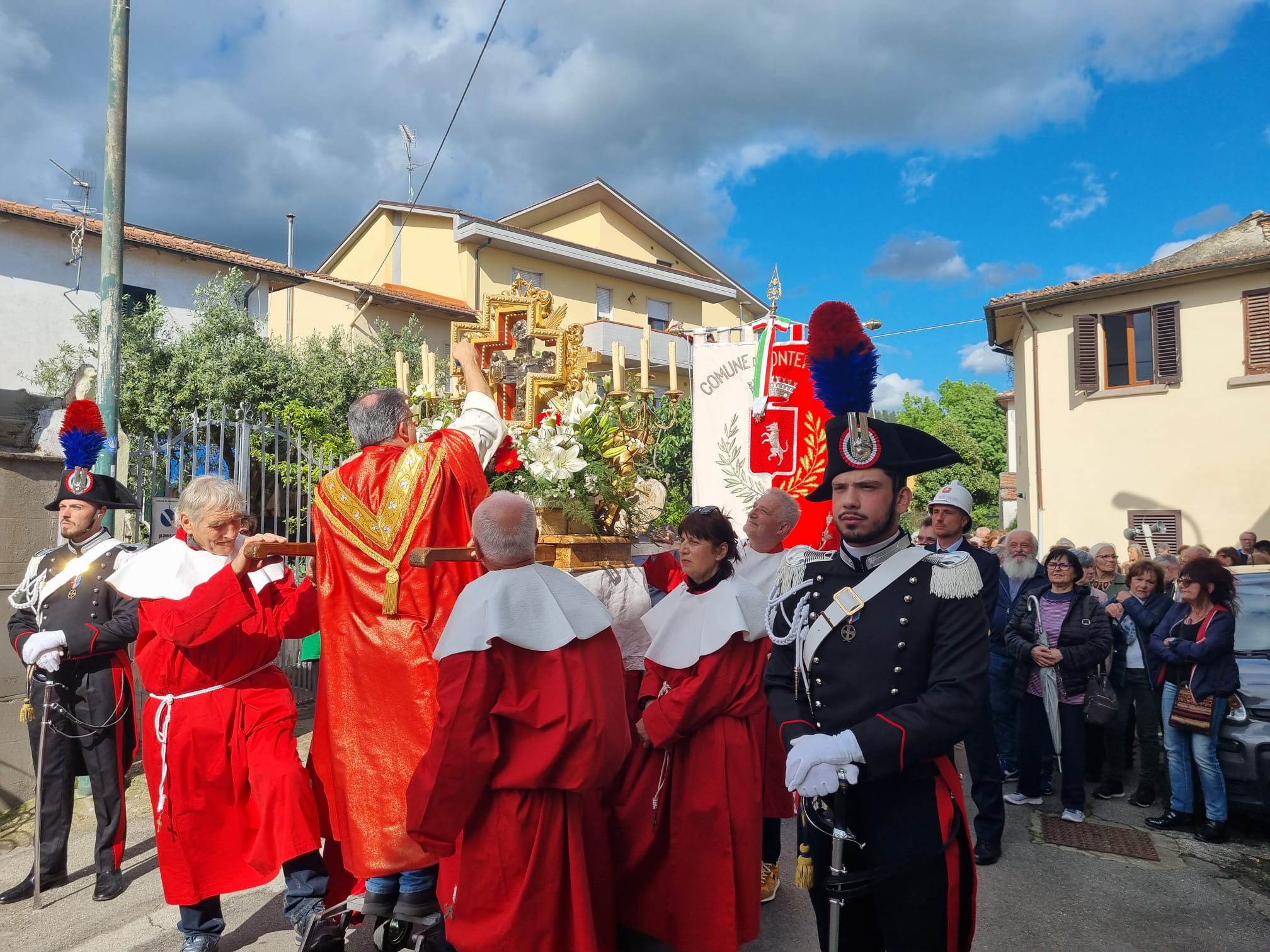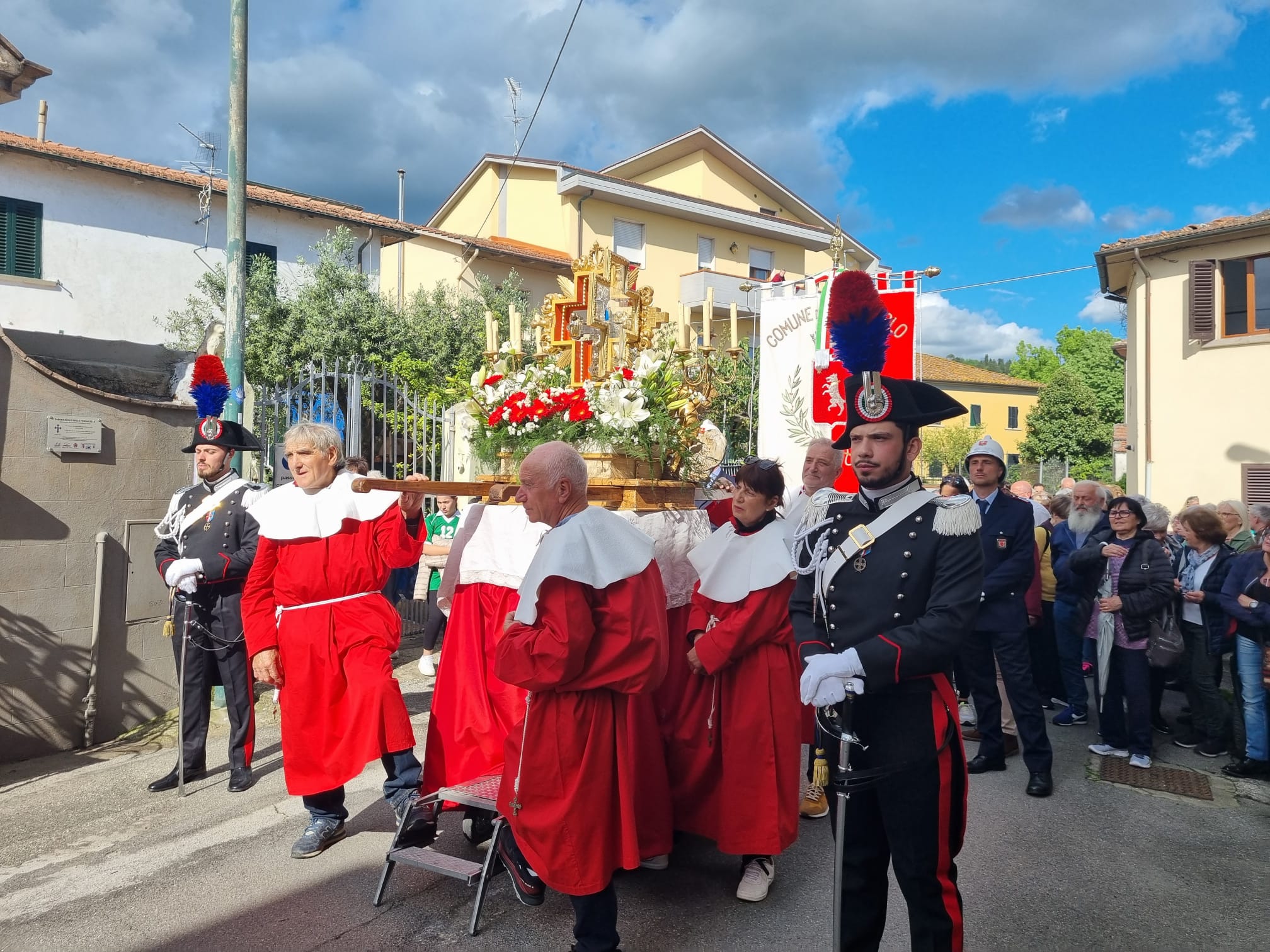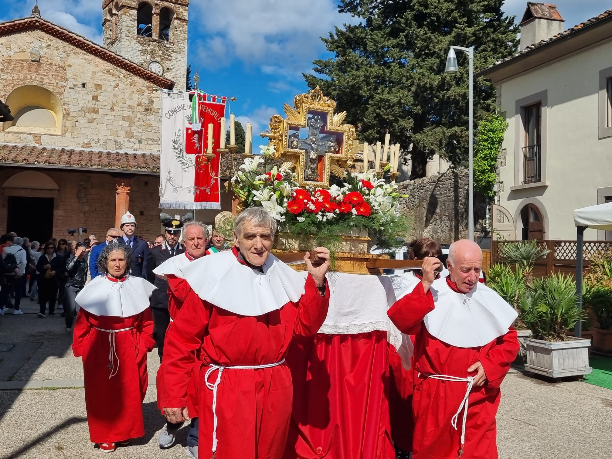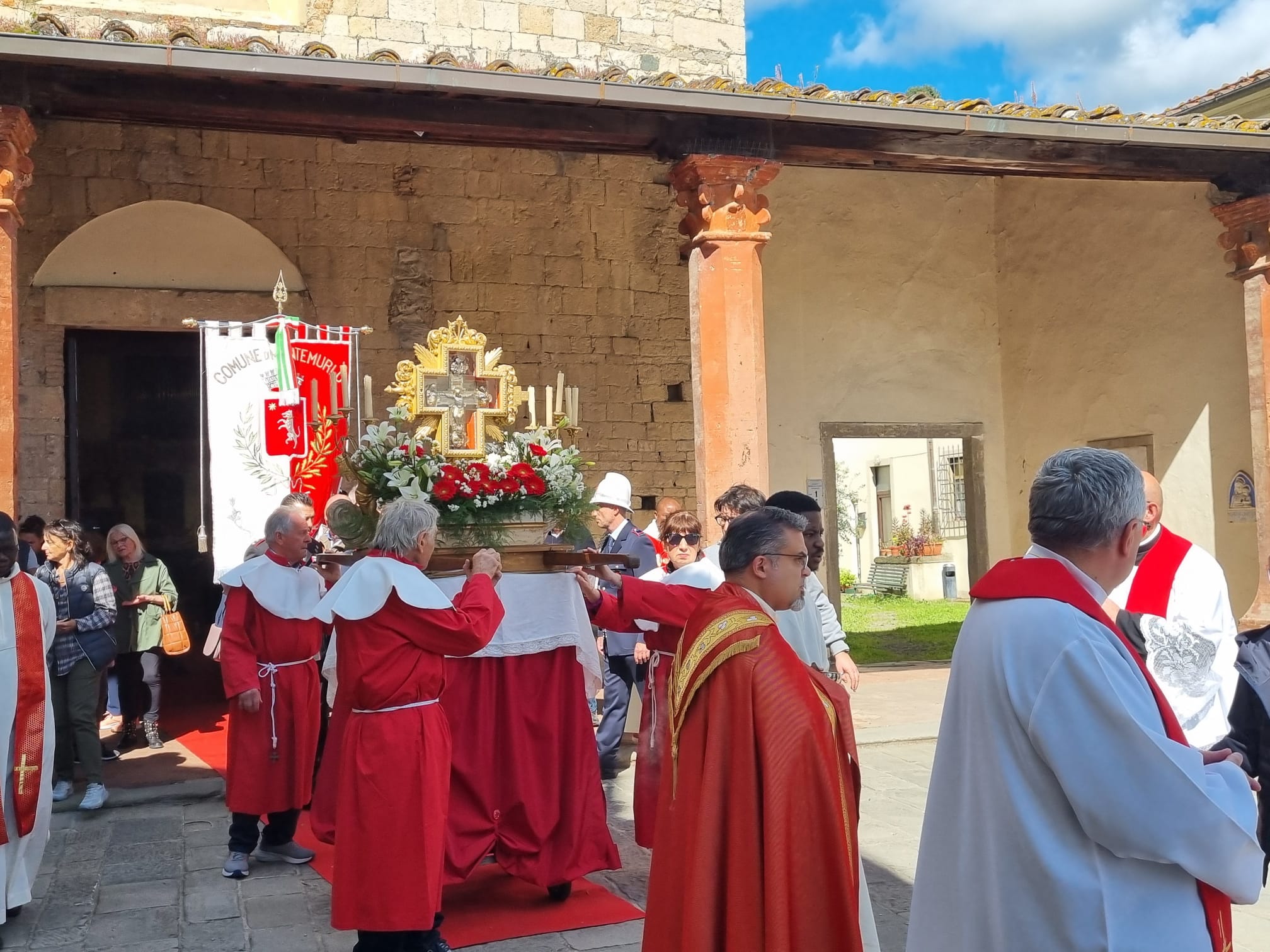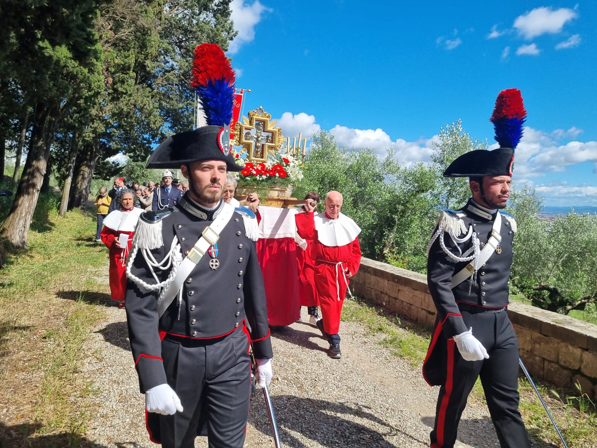 Una festa quella della Croce, importante per la tradizione e per i sentimenti di tutta la comunità. La Croce è infatti un simbolo e occasione di riflessione per pensare al futuro, alle necessità della comunità e alla pace nel mondo. In tanti anche quest’anno hanno voluto partecipare alla tradizionale processione: la piccola croce astile in lamina d’argento, risalente al XIV, ha infatti lasciato la teca sopra l’altare maggiore della pieve di San Giovanni Decollato alla Rocca dove di solito è custodita, ed è stata portata in processione scortata da due carabinieri della locale Tenenza in alta uniforme e dai custodi della Croce con i tradizionali abiti rossi e bianchi. La musica della Filarmonica Giuseppe Verdi ha accompagnato lungo tutto il percorso la processione, mentre le celebrazioni religiose sono state guidate da don Gianni Gasperini, da don Jarek della parrocchia di Fornacelle, da don Gildas della chiesa di Bagnolo e da don Roland. A seguire il gonfalone del Comune di Montemurlo con il sindaco, gli assessori della giunta, dalla comandante della polizia municipale Enrica Cappelli e da quello della Tenenza dei Carabinieri, Quintino Preite. Tante le persone che hanno seguito la croce lungo il percorso che dalla piazza della Rocca è scesa in località Morecci ed ha attraversato le strade della vecchia Montemurlo fino al tabernacolo del Campo Santo, luogo, secondo la tradizione, del miracoloso ritrovamento dopo il trafugamento dalla Pieve di Rocca.