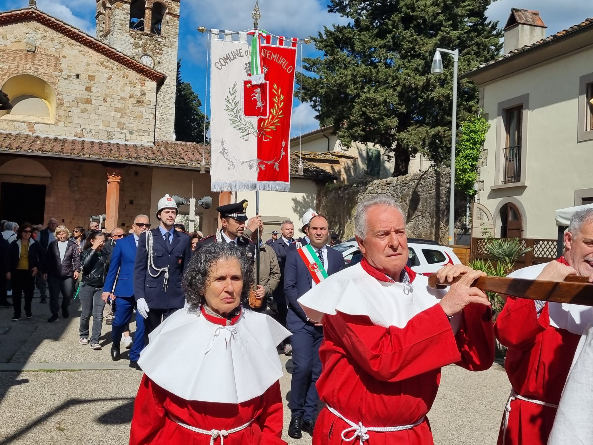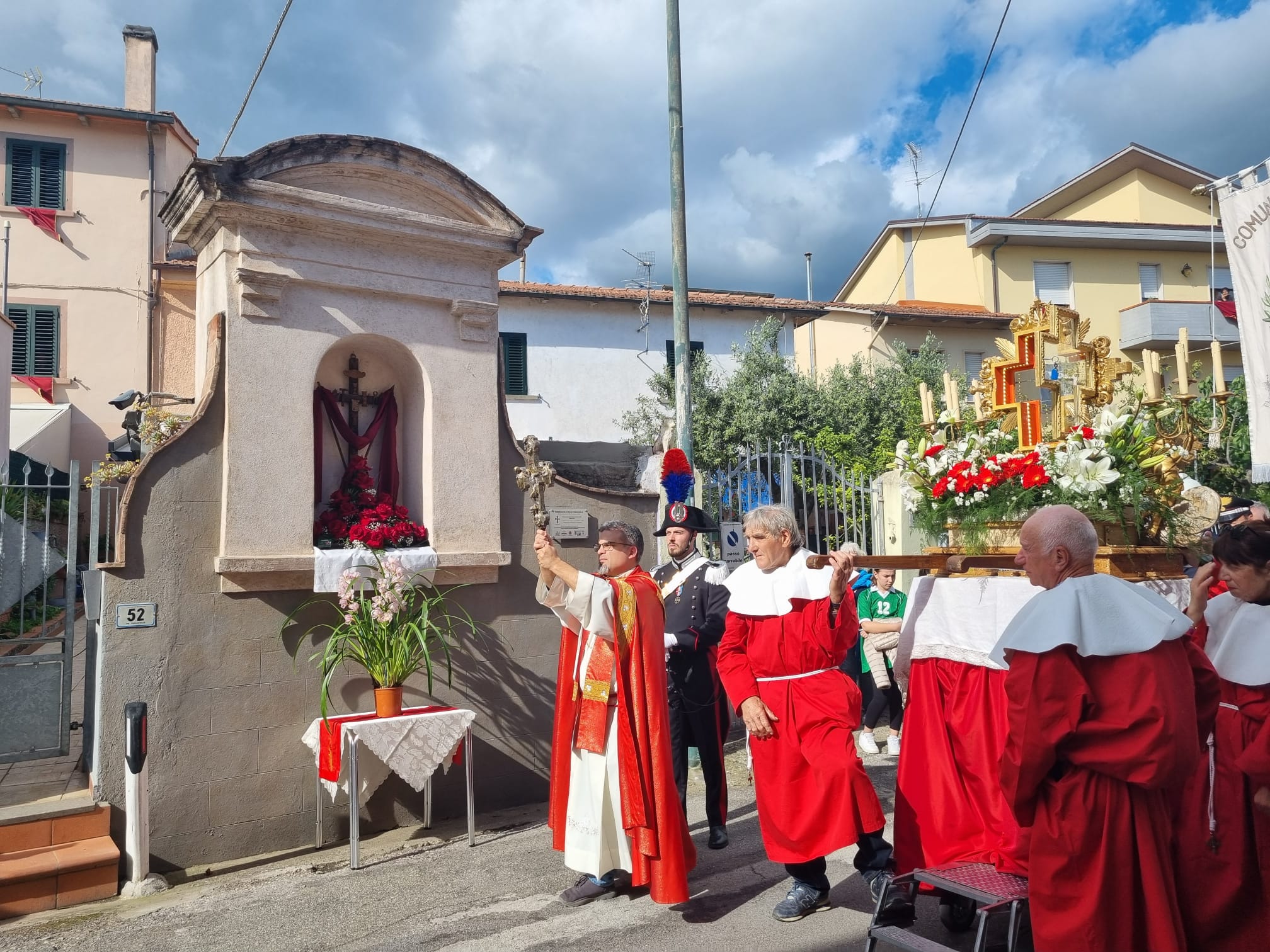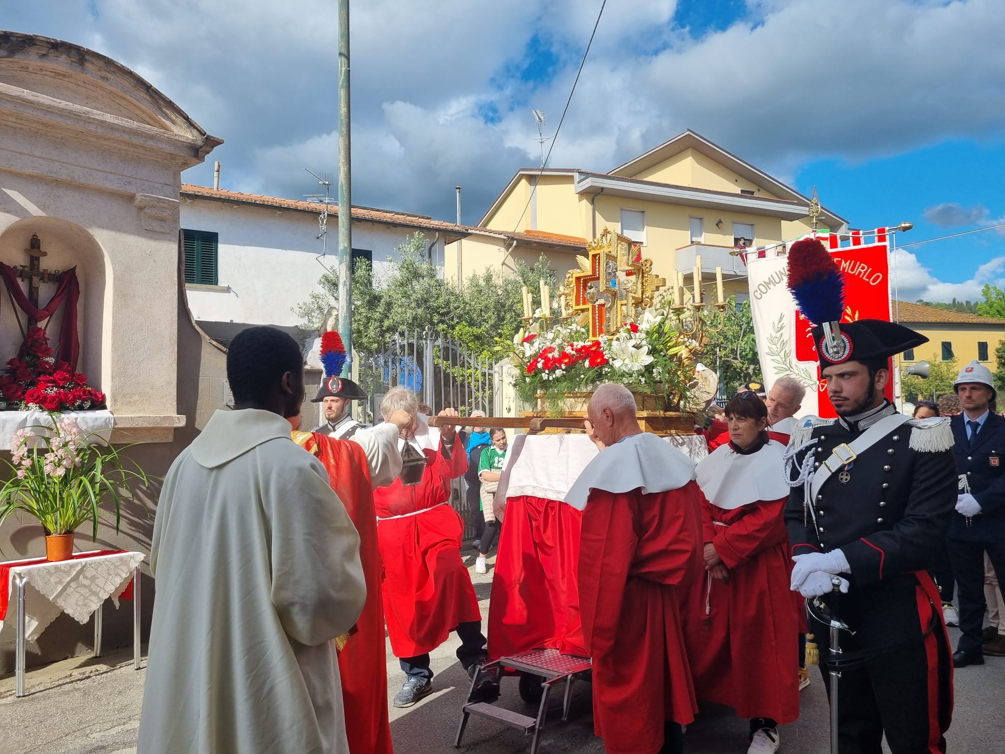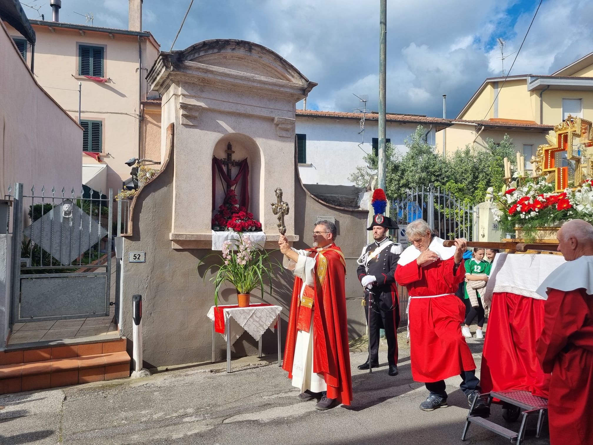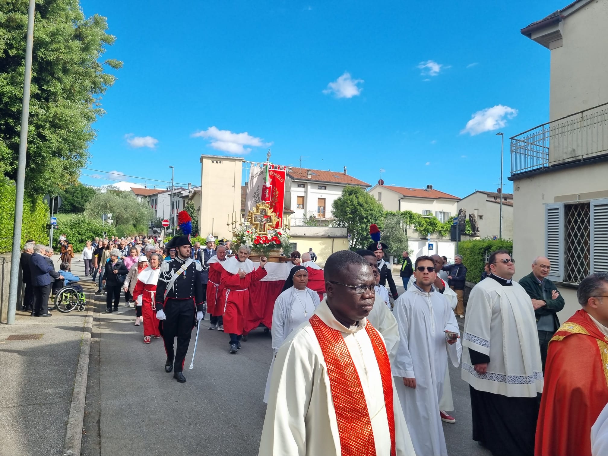 Una festa quella della Croce, importante per la tradizione e per i sentimenti di tutta la comunità. La Croce è infatti un simbolo e occasione di riflessione per pensare al futuro, alle necessità della comunità e alla pace nel mondo. In tanti anche quest’anno hanno voluto partecipare alla tradizionale processione: la piccola croce astile in lamina d’argento, risalente al XIV, ha infatti lasciato la teca sopra l’altare maggiore della pieve di San Giovanni Decollato alla Rocca dove di solito è custodita, ed è stata portata in processione scortata da due carabinieri della locale Tenenza in alta uniforme e dai custodi della Croce con i tradizionali abiti rossi e bianchi. La musica della Filarmonica Giuseppe Verdi ha accompagnato lungo tutto il percorso la processione, mentre le celebrazioni religiose sono state guidate da don Gianni Gasperini, da don Jarek della parrocchia di Fornacelle, da don Gildas della chiesa di Bagnolo e da don Roland. A seguire il gonfalone del Comune di Montemurlo con il sindaco, gli assessori della giunta, dalla comandante della polizia municipale Enrica Cappelli e da quello della Tenenza dei Carabinieri, Quintino Preite. Tante le persone che hanno seguito la croce lungo il percorso che dalla piazza della Rocca è scesa in località Morecci ed ha attraversato le strade della vecchia Montemurlo fino al tabernacolo del Campo Santo, luogo, secondo la tradizione, del miracoloso ritrovamento dopo il trafugamento dalla Pieve di Rocca.