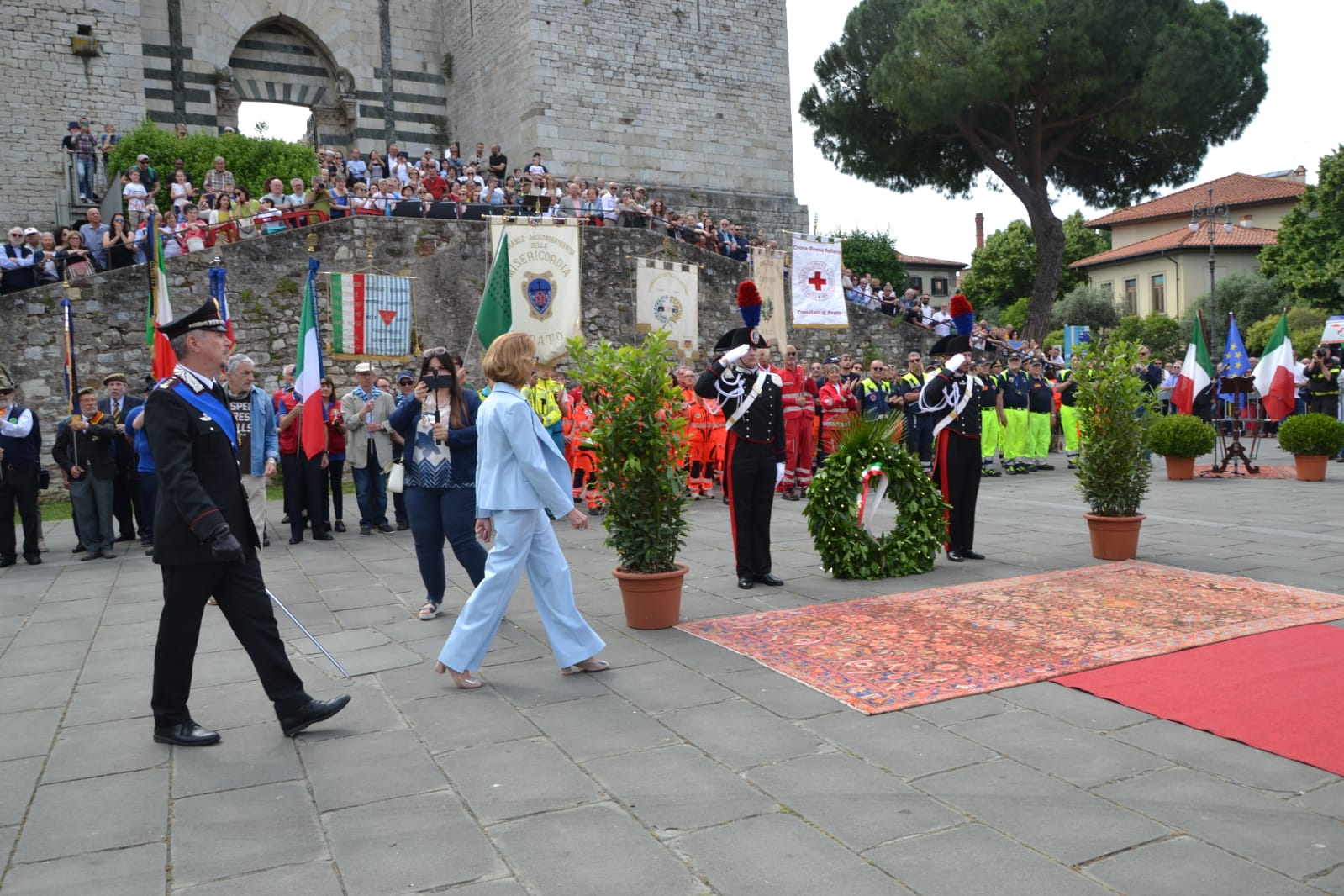 I festeggiamenti ufficiali si sono conclusi con il suggestivo dispiegamento, dalla cima delle mura del Castello dell’Imperatore, del vessillo tricolore a cura del Comando Provinciale dei Vigili del Fuoco.