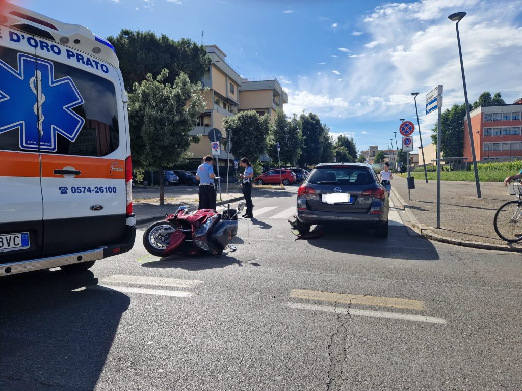 Un motociclista di 56 anni è rimasto ferito nello scontro con un’auto. L’incidente è avvenuto oggi pomeriggio poco prima delle 17 in via Valentini, all’incrocio con via Pelagatti, all’altezza della Camera di Commercio. Sul posto si sono recati la polizia municipale, i vigili del fuoco e un’ambulanza della Croce d’Oro inviata in codice rosso, che ha poi trasferito il paziente in codice giallo all’ospedale di Prato. Ancora da accertare la dinamica dell’incidente, che potrebbe essere avvenuto in corrispondenza della svolta a sinistra dell’auto in via Pelagatti.