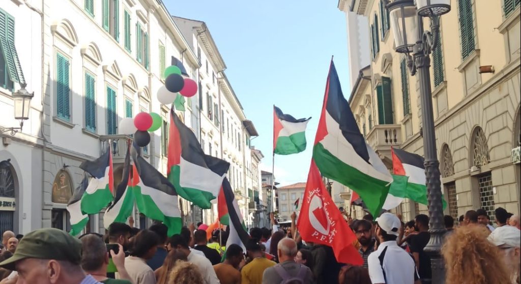 Manifestazione questo pomeriggio in centro storico in solidarietà al popolo Palestinese. A organizzarla è il sindacato autonomo Sudd Cobas di Prato e Firenze, nato dalla recente scissione da Si Cobas, sigla di livello nazionale. Il corteo si è mosso dalla stazione di Porta al Serraglio ed ha attraversato piazza Duomo per poi dirigersi in piazza Mercatale, piazza San Marco e concludere la manifestazione in piazza del Comune passando da via Santa Trinita.