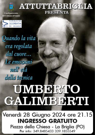 In occasione del decennale dell’associazione no profit Attuttabriglia sarà presente alla serata inaugurale degli eventi estivi il filosofo, psicanalista, saggista e giornalista Umberto Galimberti. La serata , ad ingresso gratuito, vedrà il professor Galimberti impegnato in una conferenza dal titolo “ Quando la vita era regolata dal cuore. Le emozioni nell’età della tecnica.” L’appuntamento è in Piazza della Chiesa a La Briglia, per venerdì 28 giugno a partire dalle ore 21,15 dove saranno presenti anche i rappresentanti della libreria Giunti di Prato per il firma copie.
