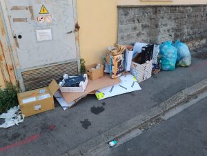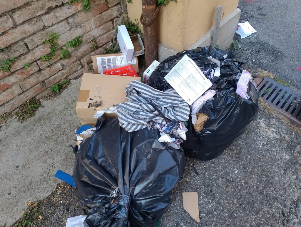 Sul marciapiedi rimangono carta, cartone, sacchetti con rifiuti in plastica e sacchi neri contenenti scarti tessili, sui quali sono già stati apposti i fogli di avviso di non conformità. Non è la prima volta che in quella zona vengono segnalati rifiuti abbandonati o conferiti in maniera scorretta. In altri casi sono stati abbandonati elettrodomestici e materassi. In una vicina corte interna sono presenti numerose aziende a conduzione cinese e la sera – raccontano i residenti – vengono accatastate vere e proprie colonne di rifiuti.
