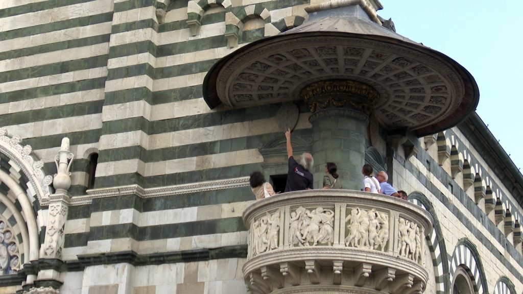 L’area del sagrato che si trova sotto al pulpito rimarrà transennata fino alla conclusione dell’intervento dei restauratori.