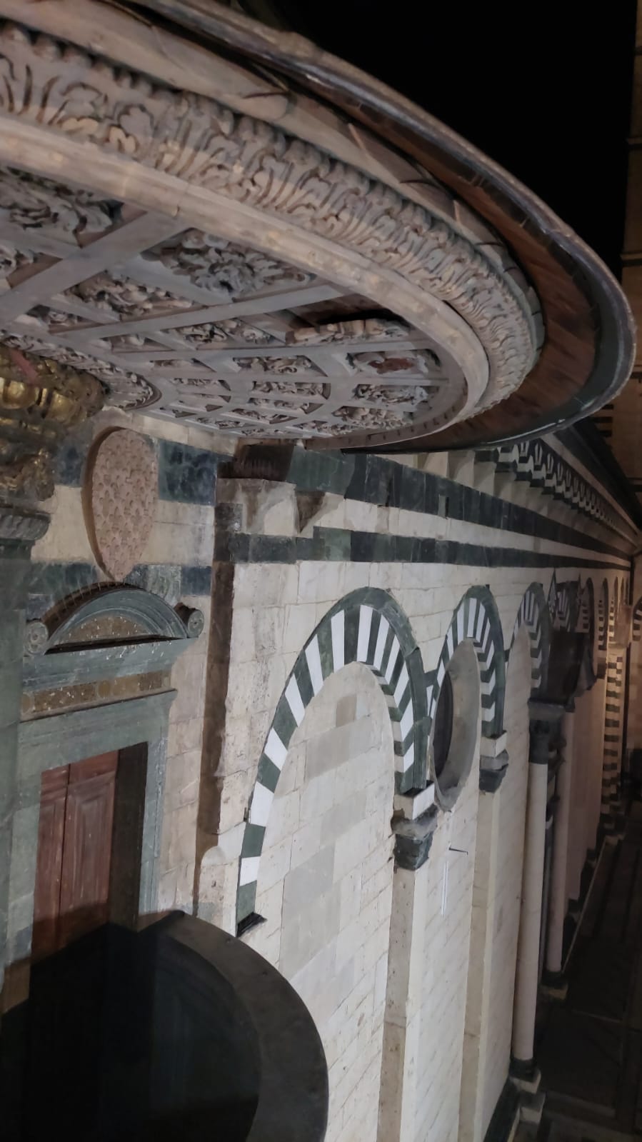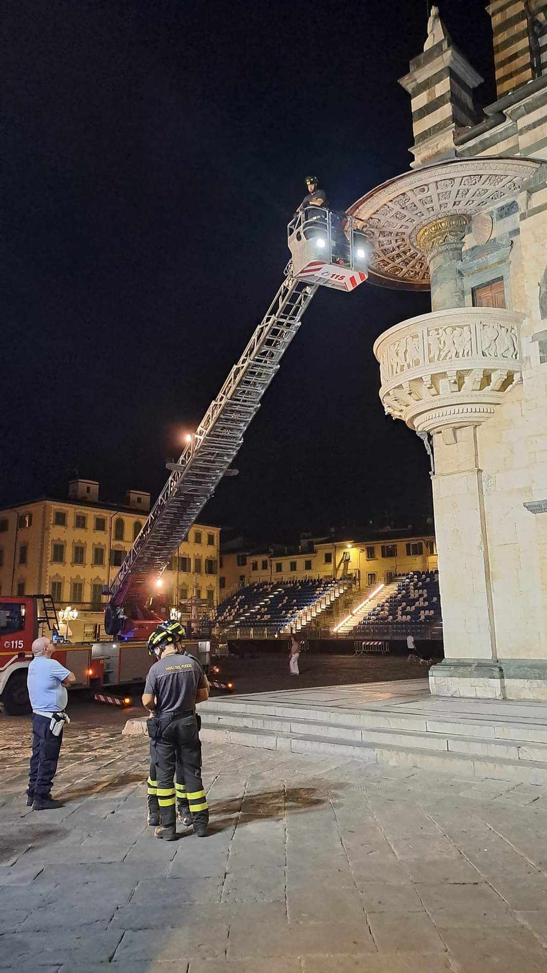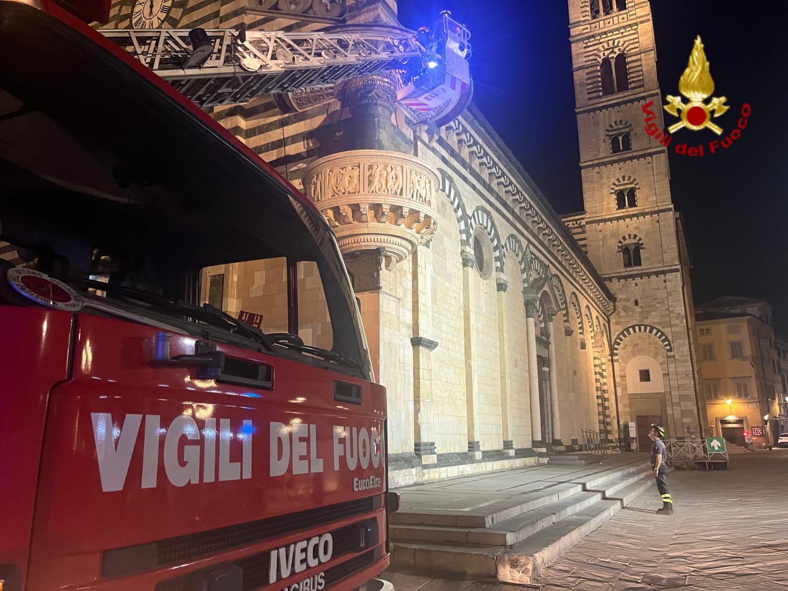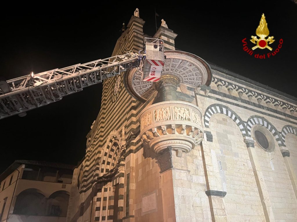 Questa notte una decorazione delle formelle che compongono la copertura superiore del pulpito della cattedrale di Prato si è parzialmente staccata. A notarla è stato un passante che ha prontamente richiesto l’intervento dei vigili del fuoco. Giunti in piazza Duomo con un autoscala, i pompieri hanno provveduto a recuperare la decorazione e a consegnarla al personale della Curia diocesana. L’area sotto il pulpito è stata temporaneamente transennata per motivi di sicurezza.