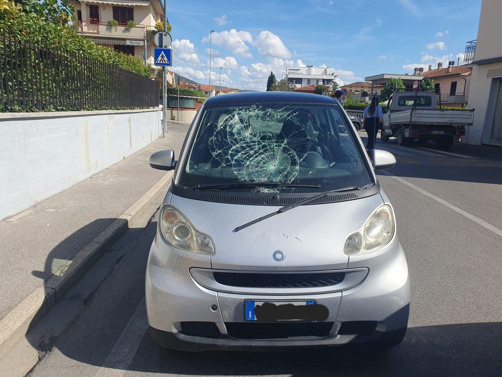 Nella foto, l’auto coinvolta nell’incidente, con i segni dell’urto sul parabrezza