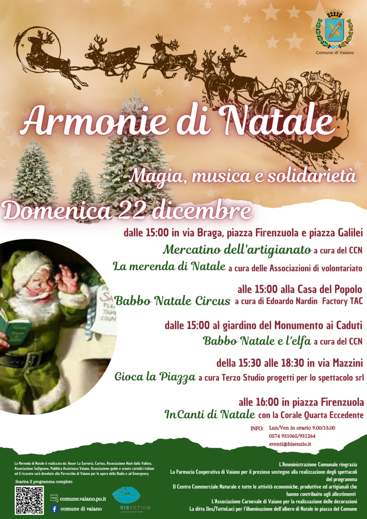 Armonie di Natale, il calendario di appuntamenti per le feste del Comune di Vaiano, entra nel vivo sabato 21 e domenica 22 dicembre. Per domenica pomeriggio il centro di Vaiano si trasforma in una sorta di villaggio delle feste con il mercatino di creazioni artigianali, musica, giochi, merenda e spettacoli dedicati a Babbo Natale, per sabato sono in agenda due iniziative musicali.