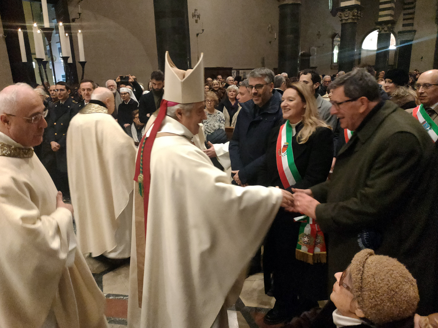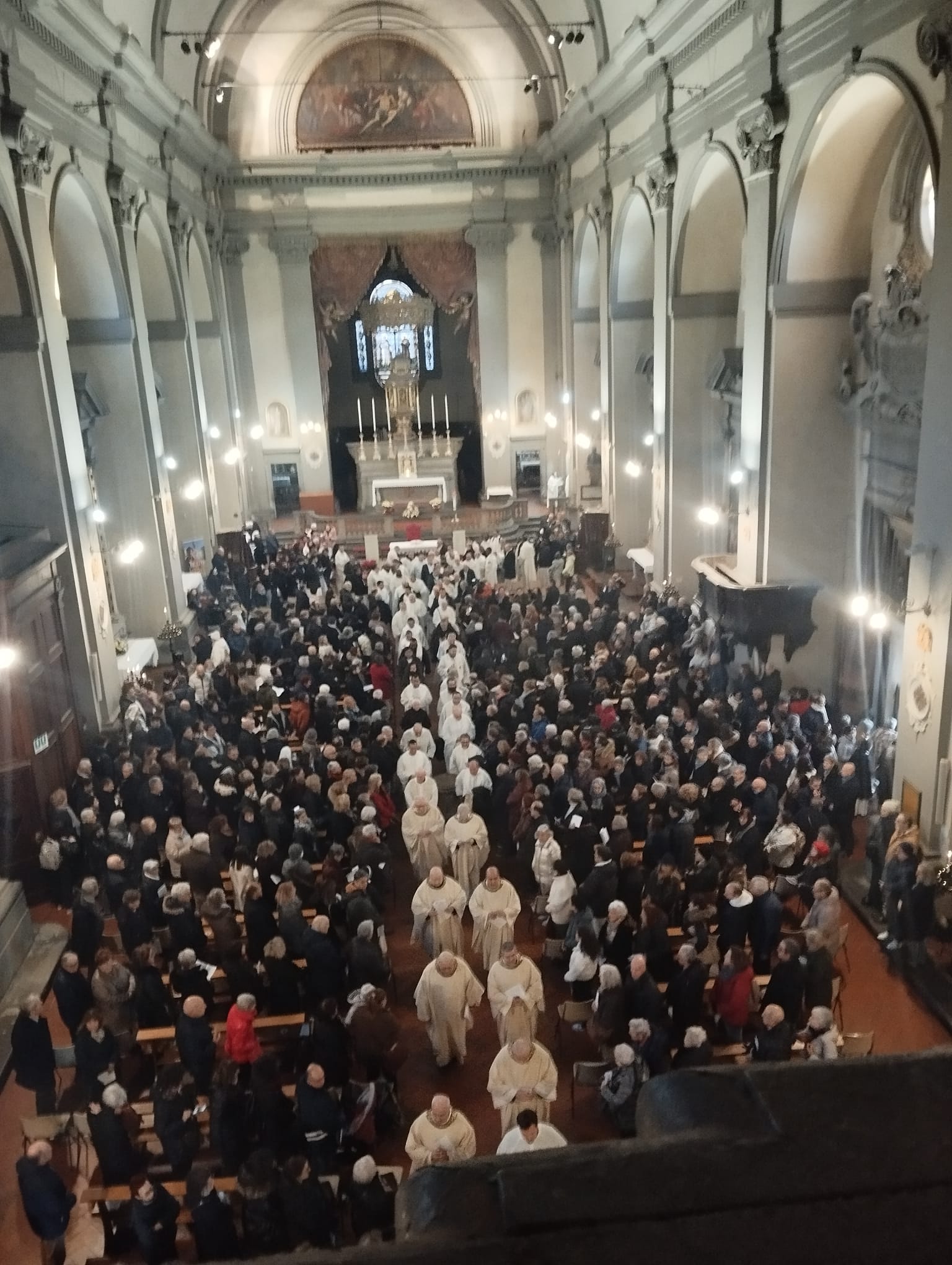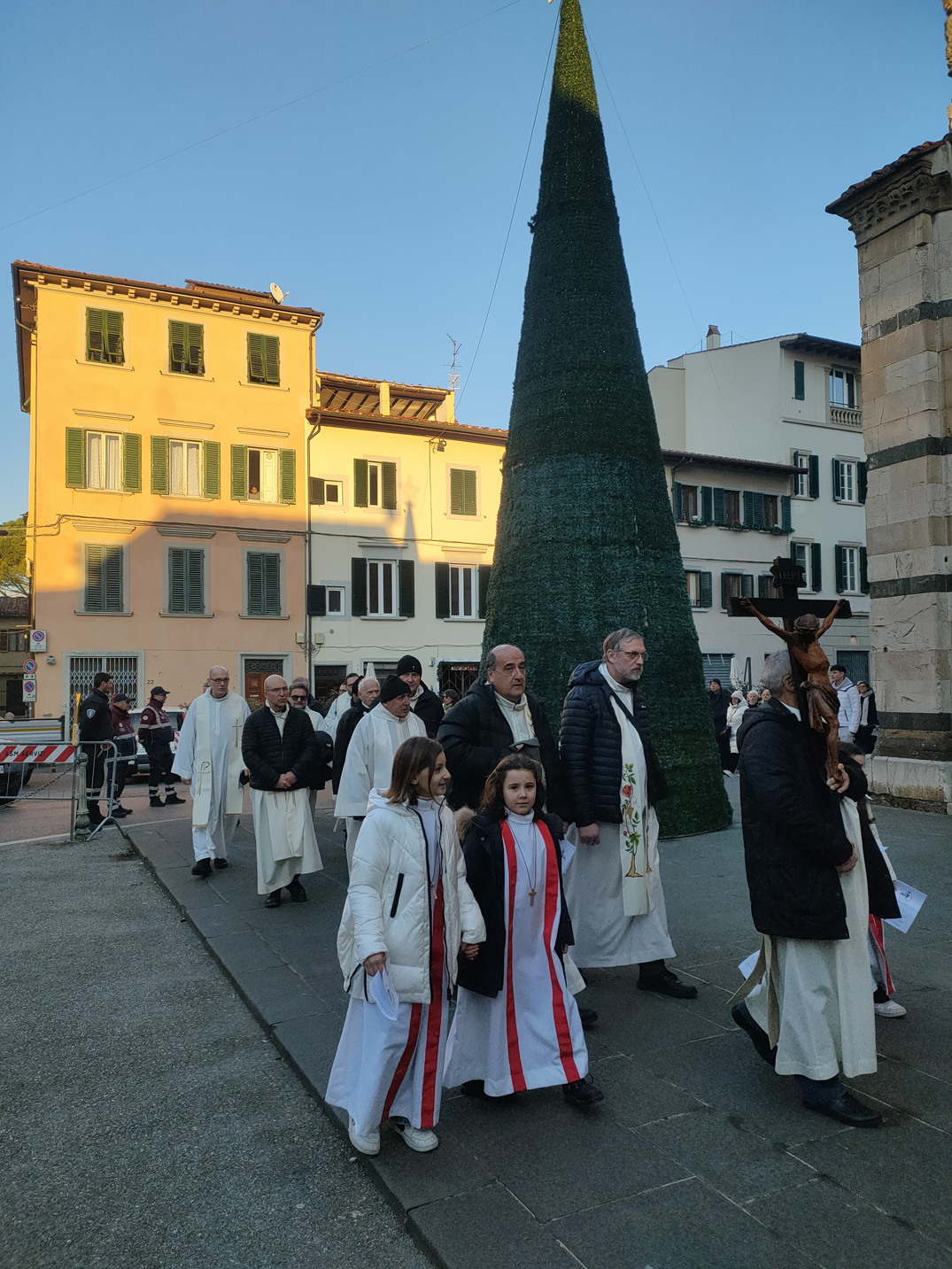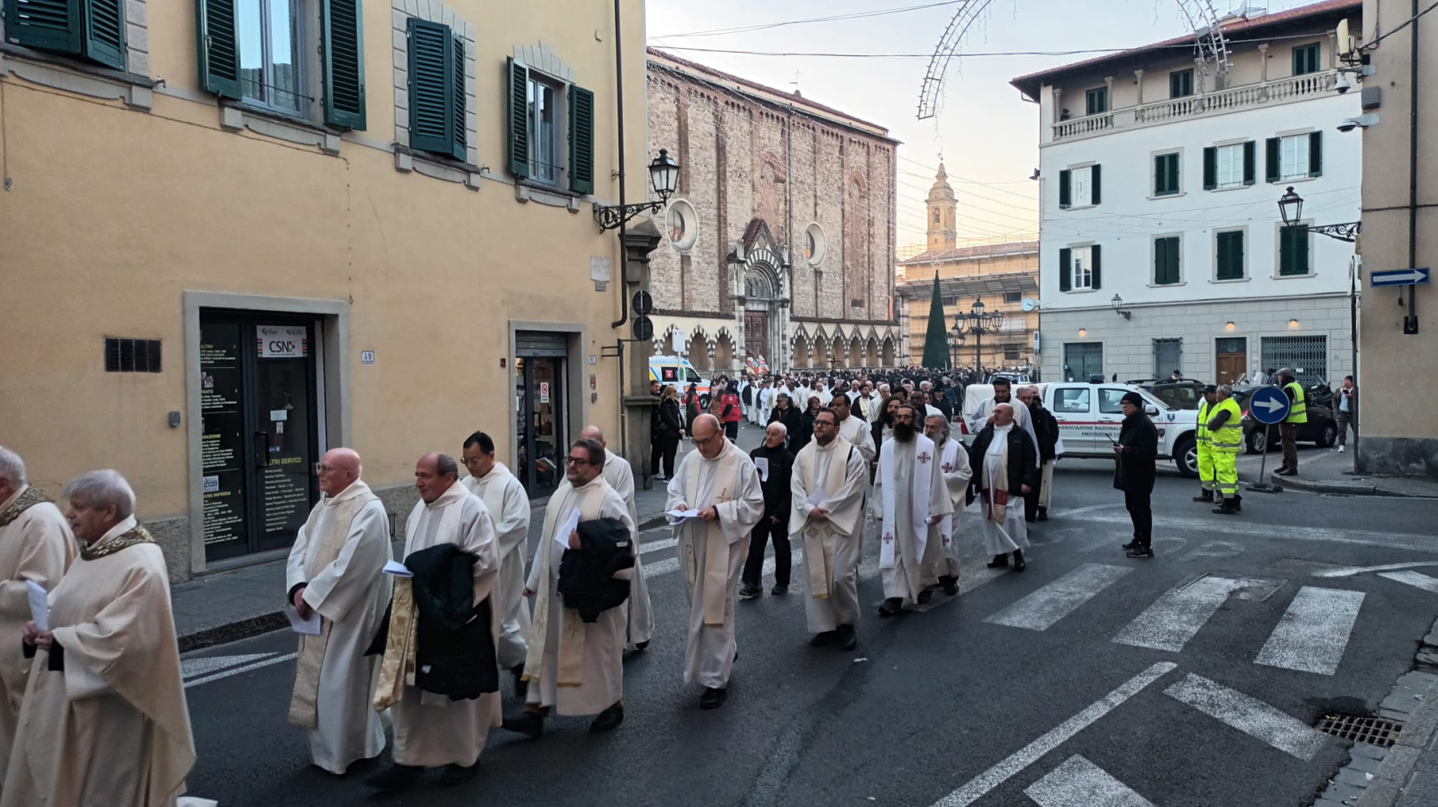 Come da programma i fedeli sono arrivati in pellegrinaggio a piedi nella chiesa di San Domenico, partendo da sei punti diversi della città. Anche qui c’è stata una grande affluenza e in tantissimi si sono sistemati nel chiostro perché la grande chiesa non bastava a contenere i presenti. Qui è stata data lettura della bolla di indizione del Giubileo e poi il vescovo Nerbini ha guidato la processione diocesana verso la cattedrale. Il lungo corteo è passato da piazza del Comune, dove ad attenderlo c’era la sindaca Ilaria Bugetti con il gonfalone e numerosi esponenti di giunta e del consiglio comunale. Presenti alla celebrazione anche i rappresentanti dei Comuni di Vaiano, Vernio e Cantagallo, appartenenti al territorio diocesano di Prato. La messa è stata concelebrata da settanta sacerdoti del clero diocesano.