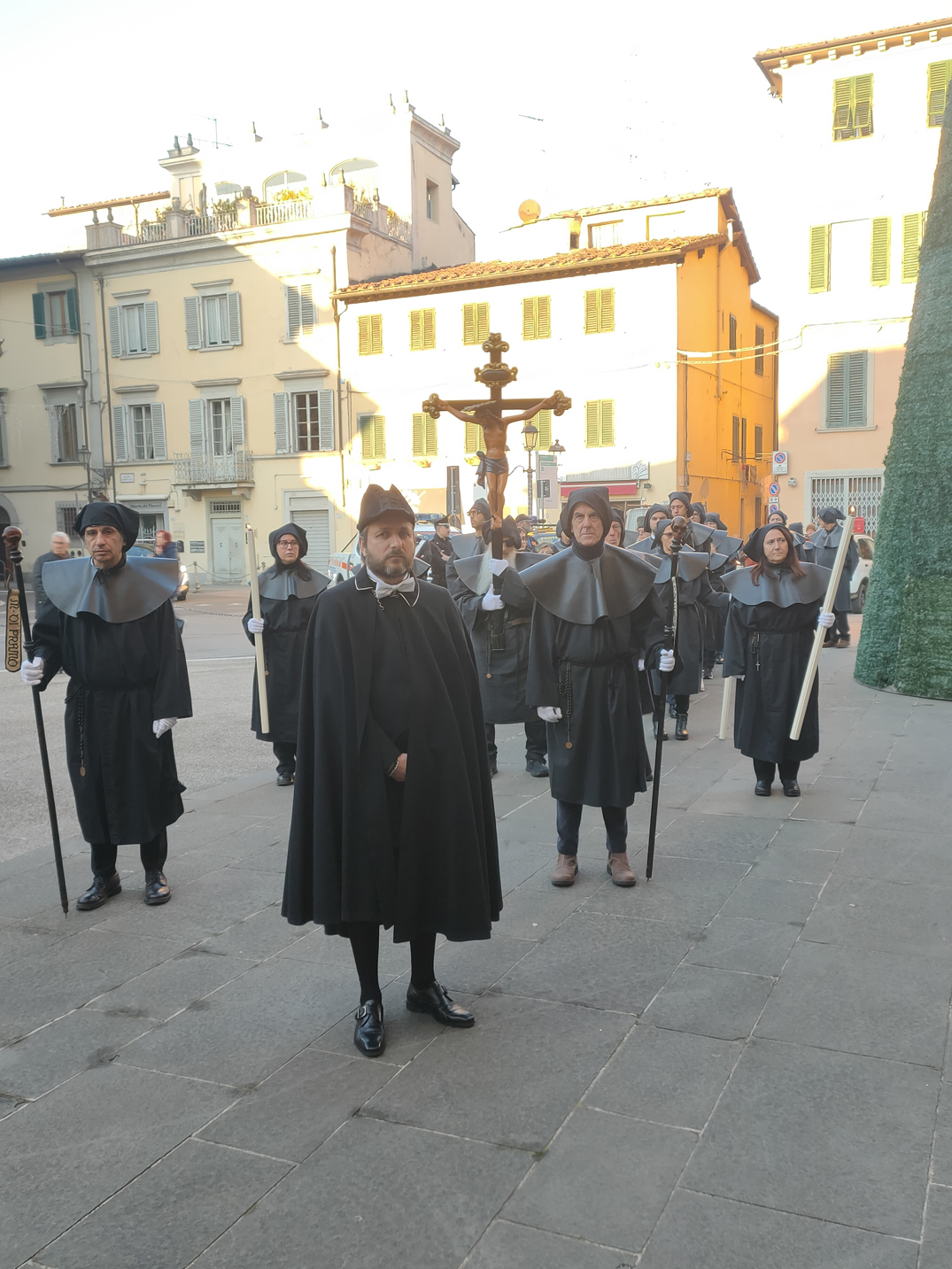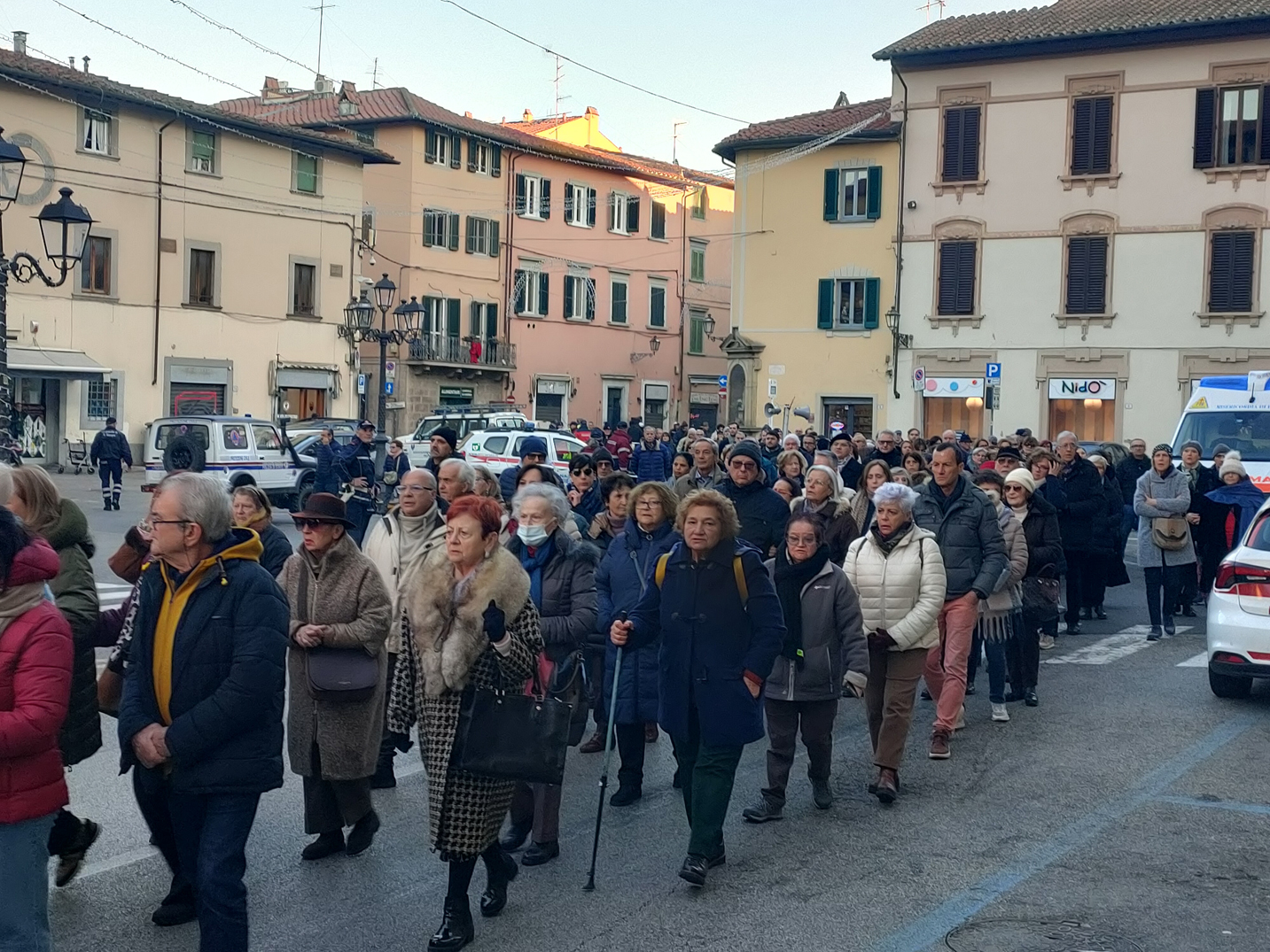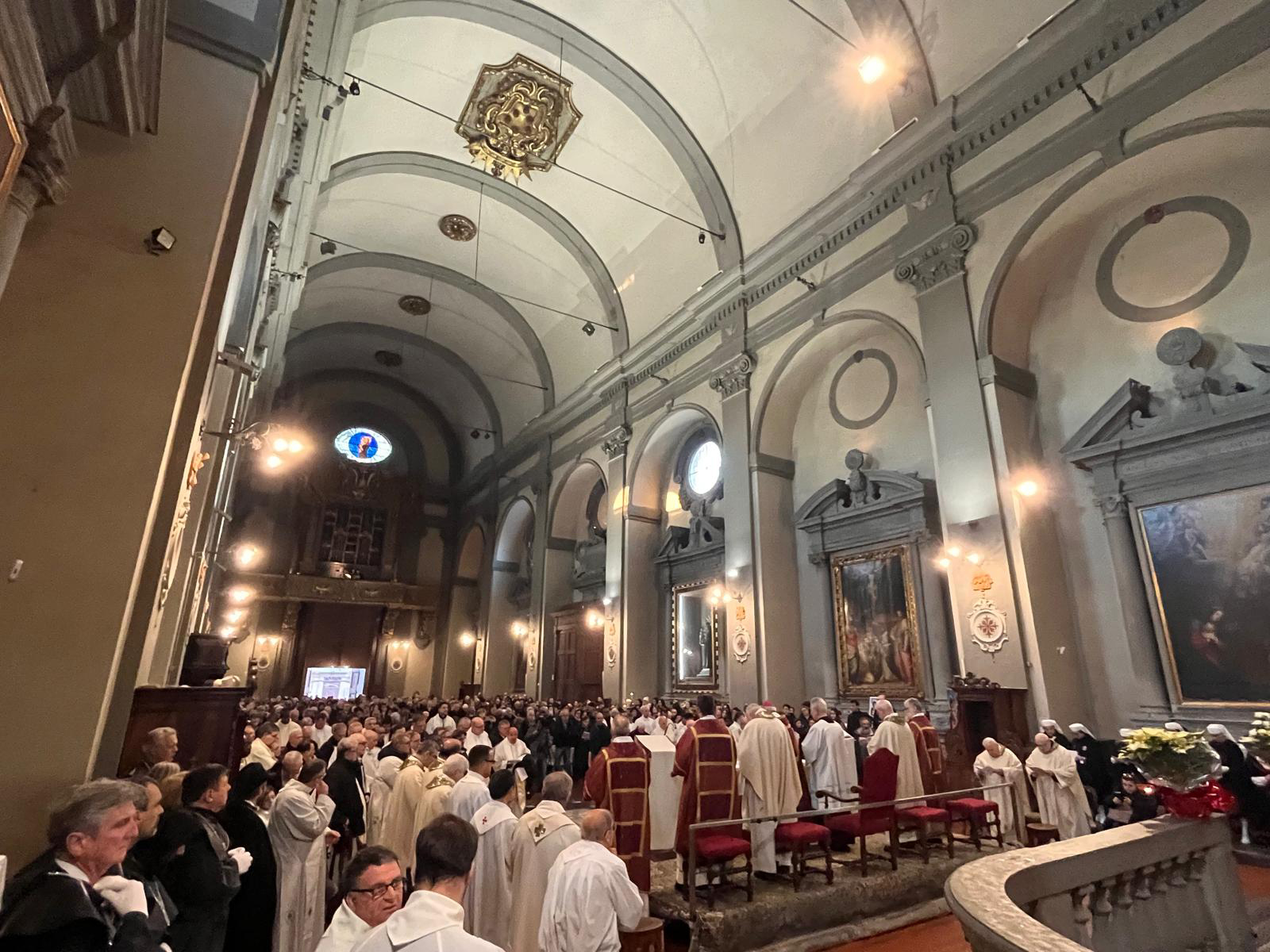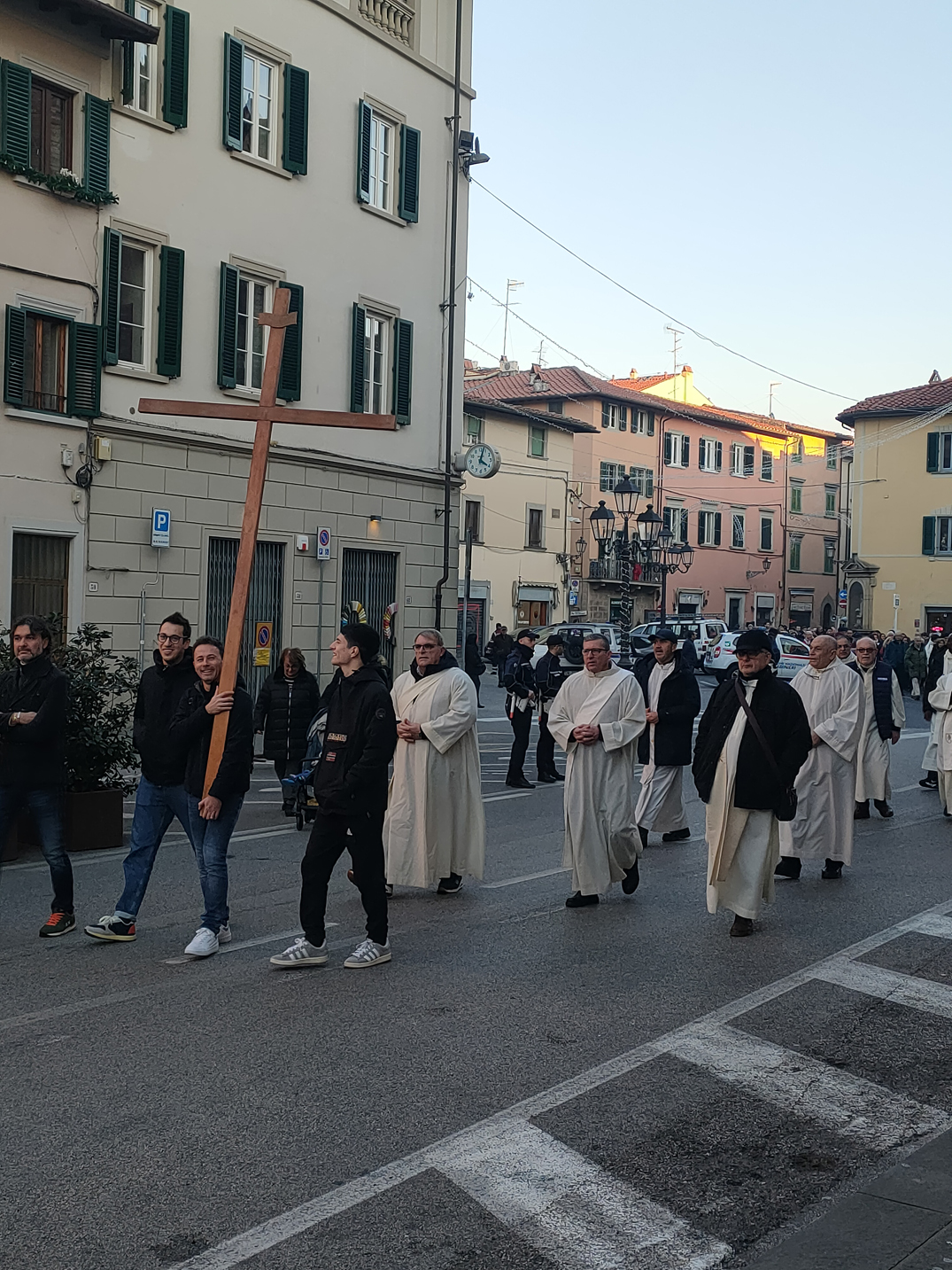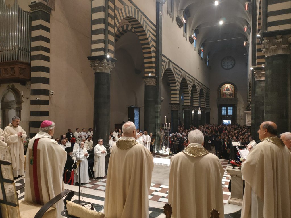 Come da programma i fedeli sono arrivati in pellegrinaggio a piedi nella chiesa di San Domenico, partendo da sei punti diversi della città. Anche qui c’è stata una grande affluenza e in tantissimi si sono sistemati nel chiostro perché la grande chiesa non bastava a contenere i presenti. Qui è stata data lettura della bolla di indizione del Giubileo e poi il vescovo Nerbini ha guidato la processione diocesana verso la cattedrale. Il lungo corteo è passato da piazza del Comune, dove ad attenderlo c’era la sindaca Ilaria Bugetti con il gonfalone e numerosi esponenti di giunta e del consiglio comunale. Presenti alla celebrazione anche i rappresentanti dei Comuni di Vaiano, Vernio e Cantagallo, appartenenti al territorio diocesano di Prato. La messa è stata concelebrata da settanta sacerdoti del clero diocesano.
