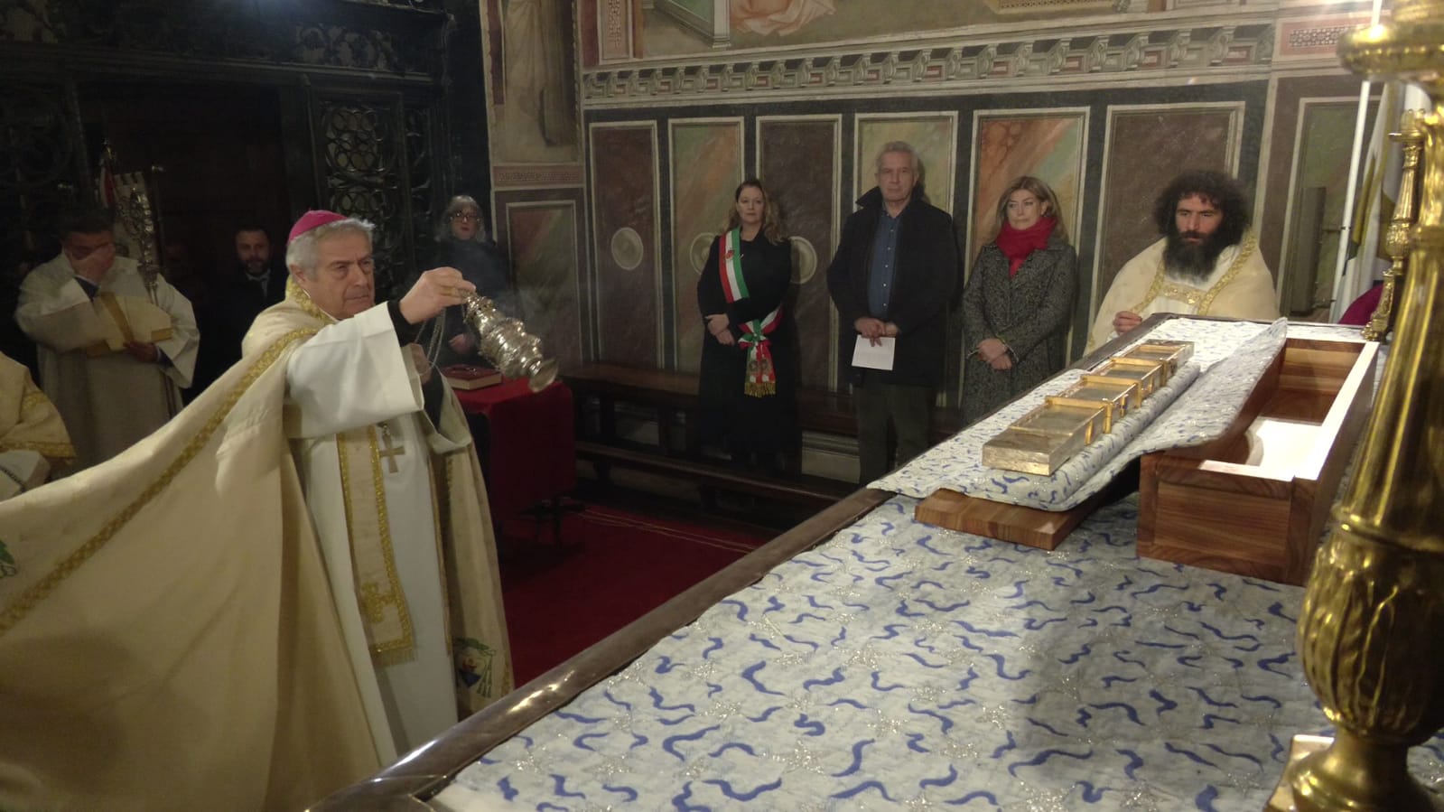 L’ostensione è stata seguita dall’esposizione del «sasso» di Santo Stefano. Il reliquiario contenente il sasso che la tradizione vuole sia stato uno di quelli con cui fu lapidato il Santo, è stato portata in processione, dalla Cappella del Sacro Cingolo all’altare maggiore.
