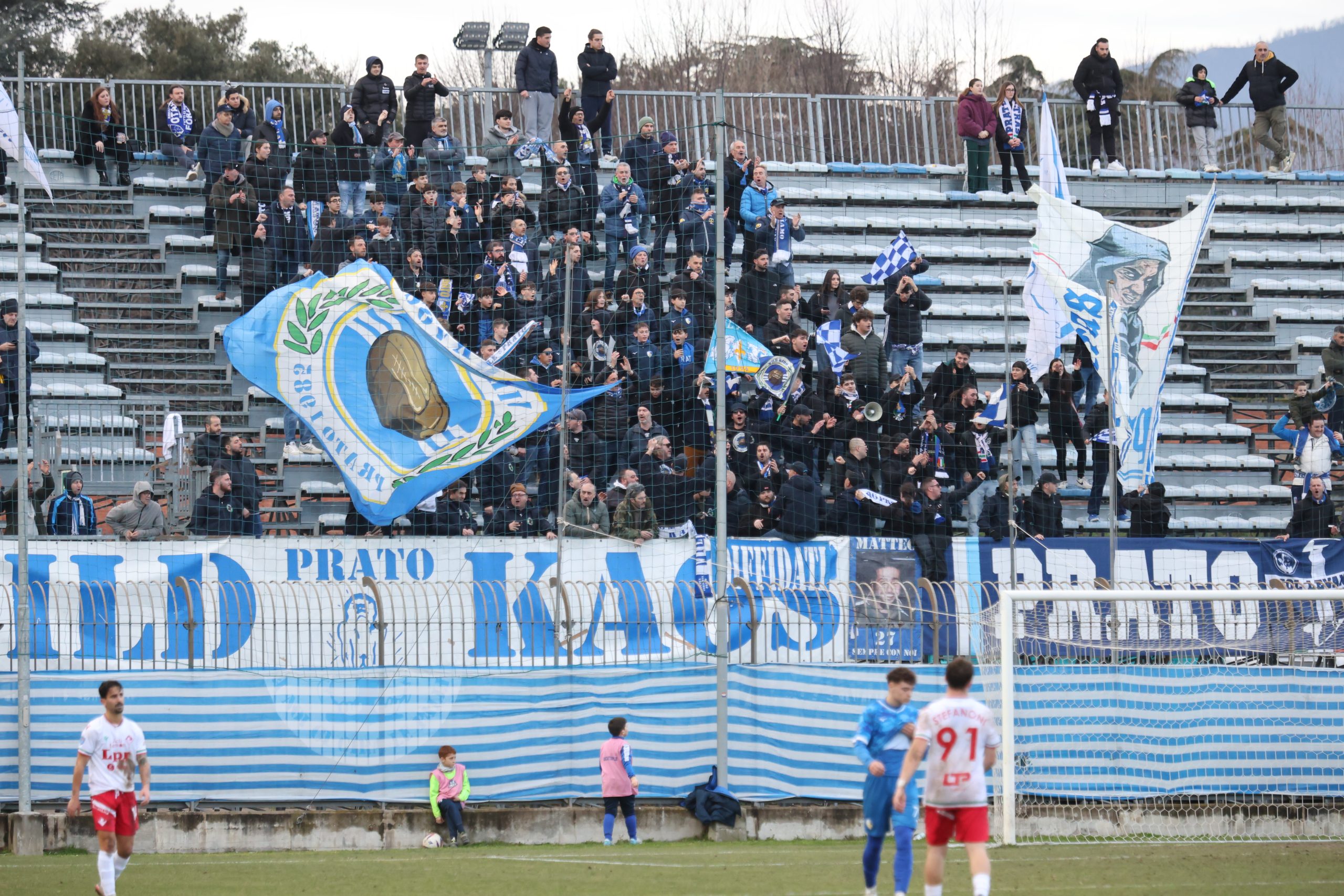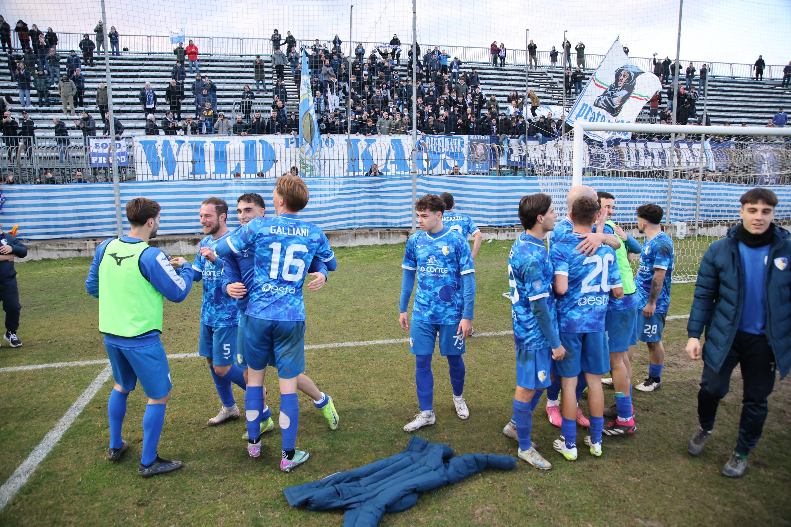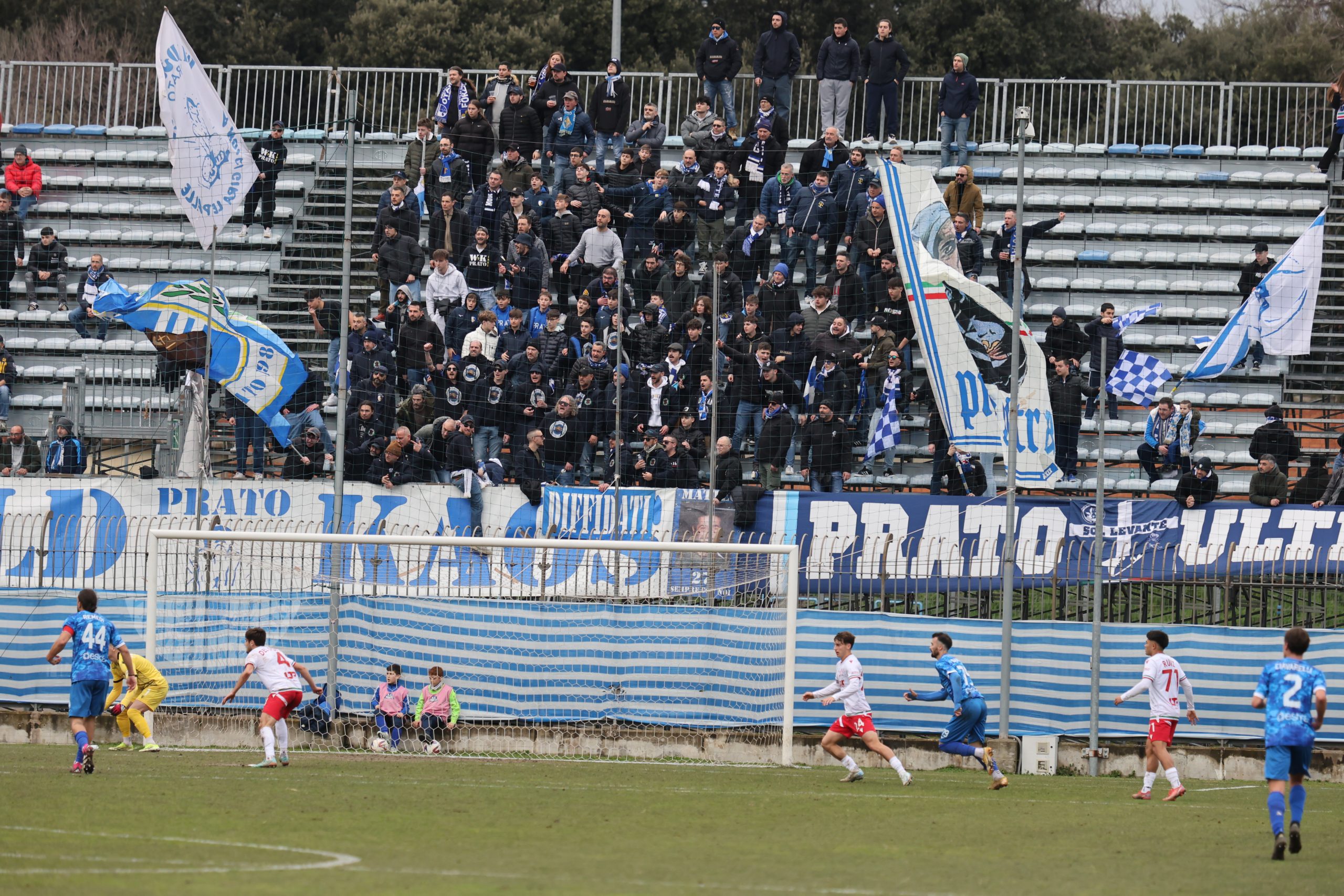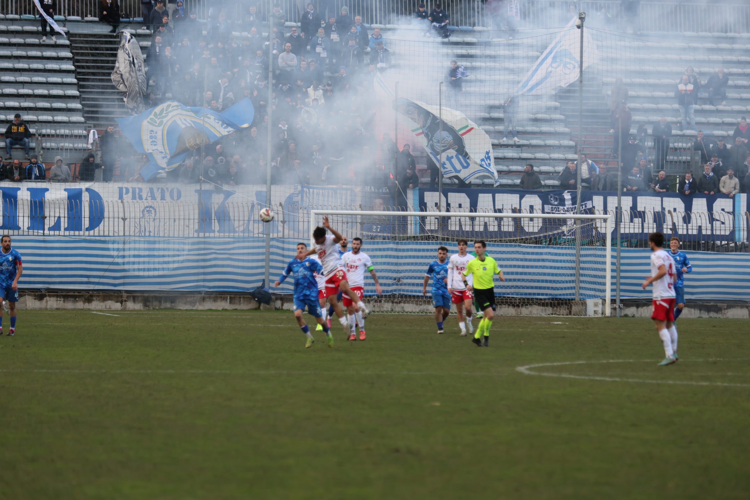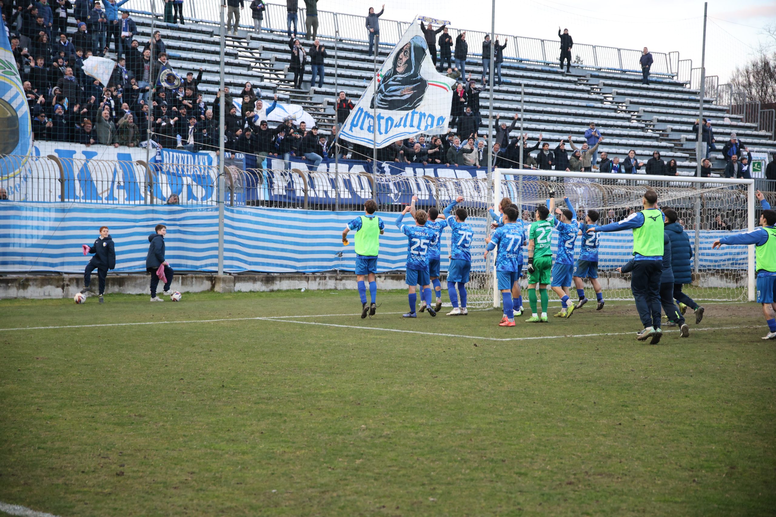 Tifo bollente in tribuna con buona rappresentanza ospite e tanti tifosi biancazzurri presenti. Si parte col Piacenza che va al tiro con Recino da centro area: alto sopra la traversa al 4’. Risponde Mazza al 9’ con un bel tiro dai venti metri finito anche questo sopra il montante. Il taccuino torna a sporcarsi al 26’ con la combinazione Cozzari-Di Stefano: conclusione a giro del numero 24 laniero e palla di pochissimo alta sopra l’incrocio. Preludio al gol che arriva al 28’: cross di Remedi da destra, Limberti tiene palla sul lato opposto, palla per Cozzari che serve l’accorrente Girgi che ingaggia un bell’uno-contro-uno con la difesa biancorossa e mette dentro (1-0). Pronta la reazione del Piacenza che si riversa in attacco costringendo il Prato a stare troppo tempo in difesa e a beccare qualche cartellino pesante, come quello a Galliani al 39’. Nell’intervallo nervi tesi negli spogliatoi al rientro e ne fa le spese Barbuti che viene espulso da Santinelli per un diverbio con un avversario. In apertura di secondo tempo, il nervosismo si fa sempre più consistente e l’arbitro fa fatica a tenere a bada i 21 giocatori in campo. All’8° Fantoni si supera sul diagonale ravvicinato di D’Agostino e mister Marco Mariotti corre ai ripari inserendo Giusti per Ciavarelli. La squadra laniera lotta col cuore e non disdegna comunque di rispondere di rimessa, come al 18’ con Remedi che colpisce la traversa dal limite dopo una bella volata di Di Stefano sulla sinistra. Il neo entrato Stefanoni al 21’ si fa subito notare con un diagonale che sfiora il palo della porta di Fantoni. Traversa al 25’ sempre con Stefanoni di testa, che colpisce la parte alta del montante. Fuori Cozzari e Di Stefano, dentro Alessio Rossi e Magazzù. Brividi su una incornata di Recino al 28’: fuori di poco. La partita prosegue con tanta elettricità in campo. I biancazzurri lottano col cuore, con tutte le energie rimaste, rafforzate da quelle proposte dai nuovi entrati come Azzizi (al posto di Remedi). Al 90’ Recino dà un cioccolatino a Castelli che si avvita in area, colpisce bene ma prende la traversa. Nei sei minuti di recupero il Piacenza spinge ma non segna, come sul tiro di Recino dopo un palo su angolo di D’Agostino e salvato da Galliani di petto a Fantioni battuto. E il Prato può festeggiare insieme ai suoi tifosi in un pomeriggio.
