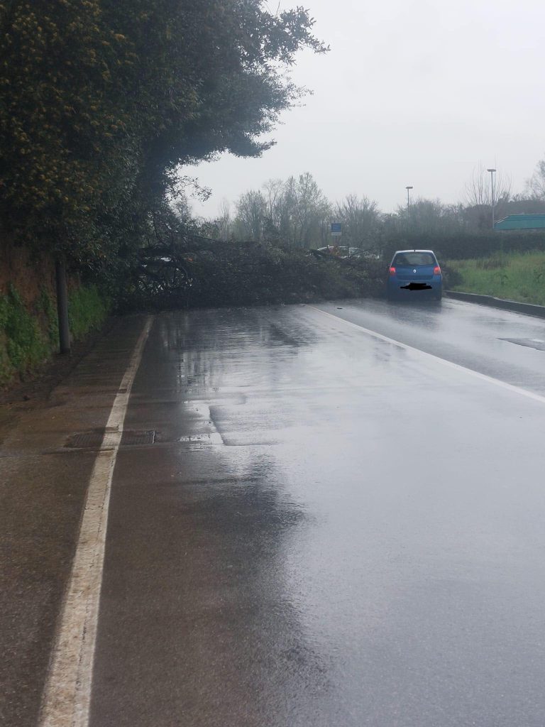 E’ successo verso le 11. La pianta è finita sulla strada, invadendo completamente la carreggiata e sfiorando un’auto che stava sopraggiungendo. Per fortuna non sono rimasti coinvolti veicoli e persone.