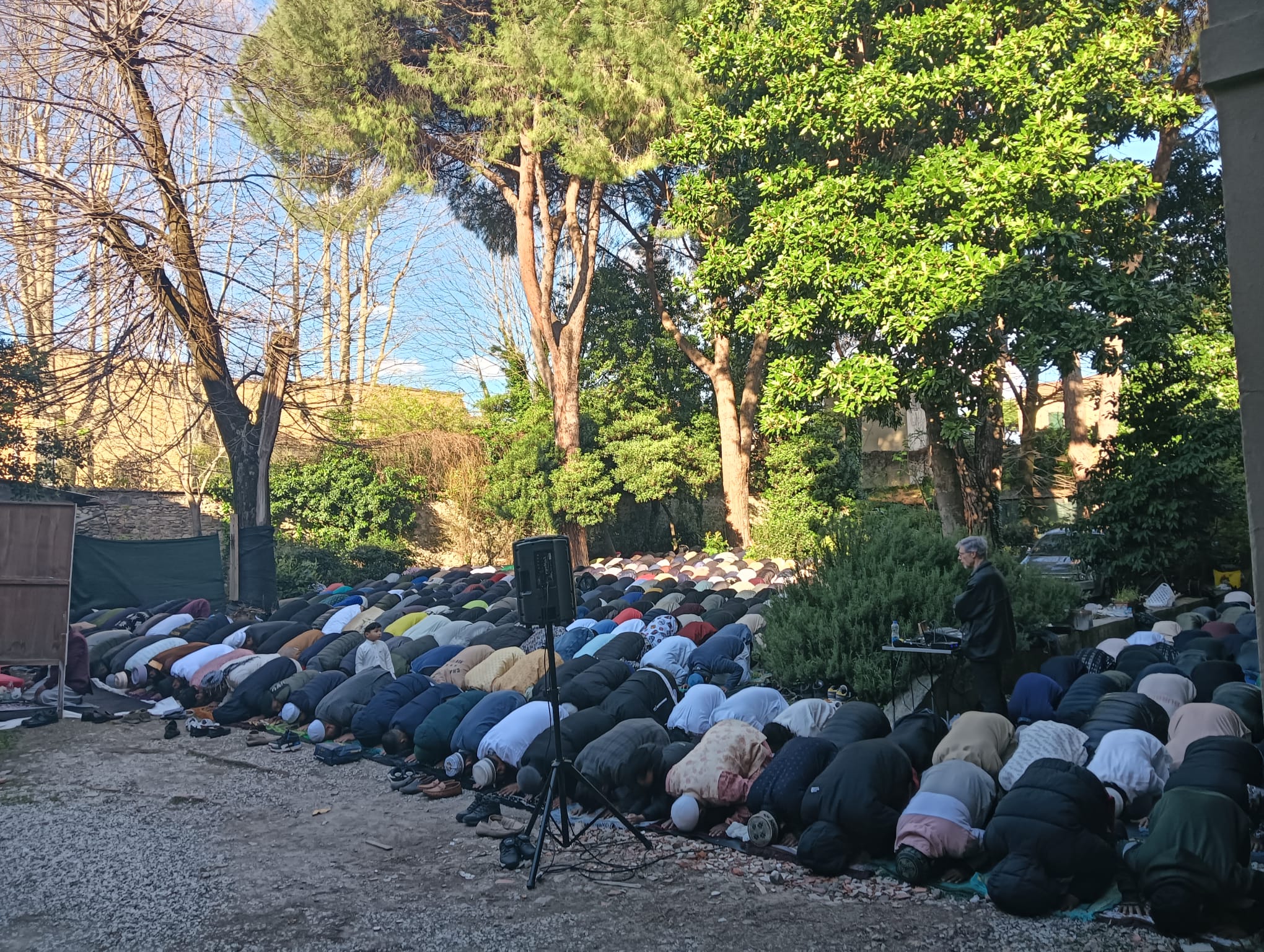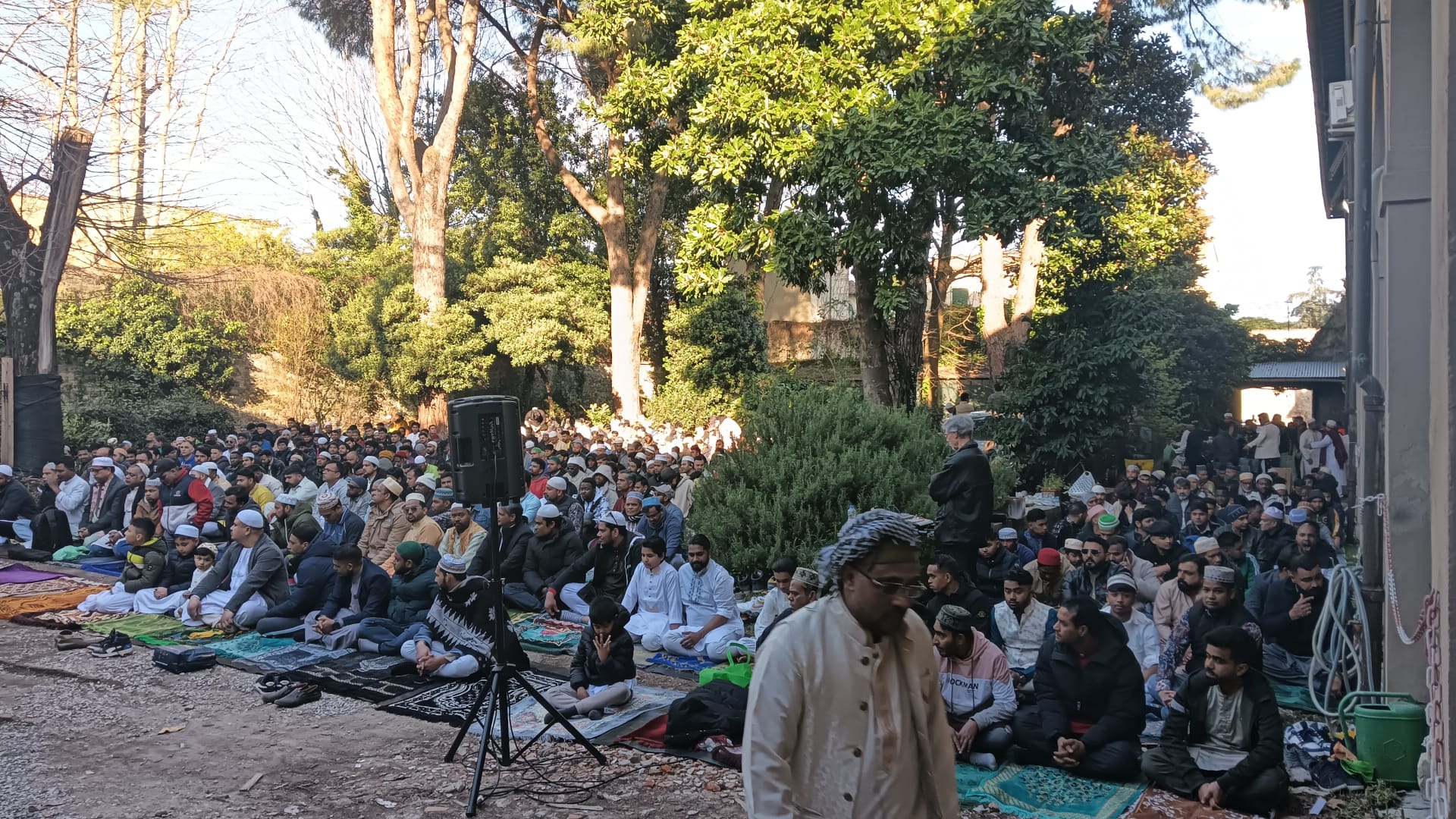 Questa mattina poco prima dell’alba i bengalesi del Centro islamico hanno sistemato l’ambiente dispiegando tappeti e stuoie per far inginocchiare i fedeli partecipanti alla preghiera. Il rito, come prevede la tradizione, si è svolto con la divisione tra uomini e donne, con quest’ultime che hanno utilizzato una stanza del complesso. Non è stata utilizzata la chiesa, né altri ambienti dedicati al culto cristiano cattolico.
