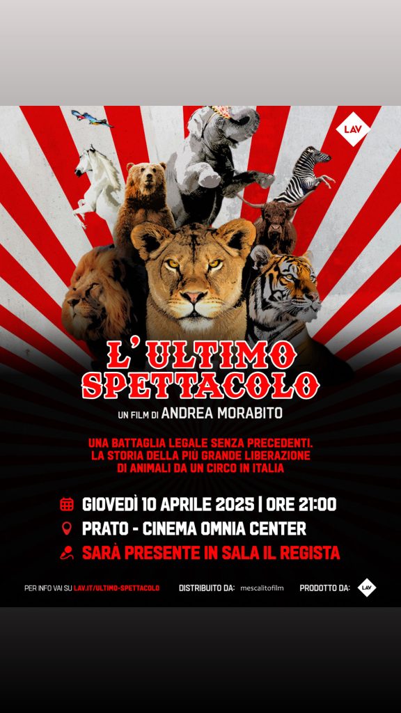 Prato ospita una serata di grande impatto civile e culturale con la proiezione del docufilm “L’Ultimo Spettacolo”, il primo film prodotto da LAV – Lega Anti Vivisezione. L’appuntamento è fissato per stasera giovedì 10 aprile alle ore 21:00, presso il Cinema Multiplex Omnia Center di Prato. Il film racconta una vicenda realmente accaduta che ha segnato un punto di svolta nella storia della tutela degli animali in Italia: il sequestro di tutti gli animali del Circo Martin, frutto di una lunga e complessa battaglia legale portata avanti da LAV e dagli attivisti di Cagliari.