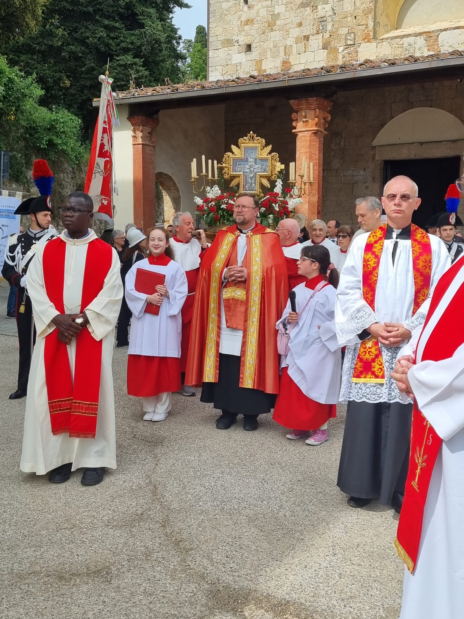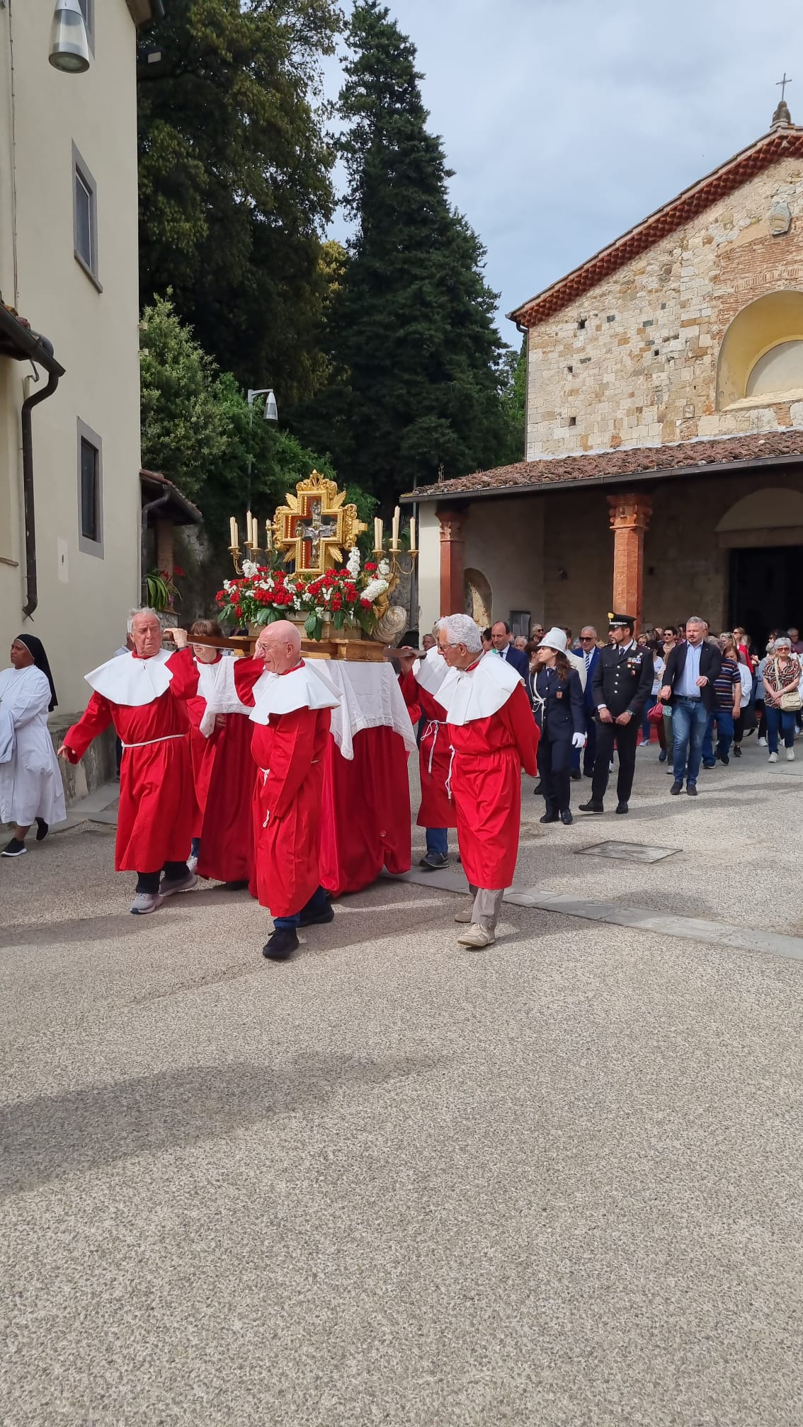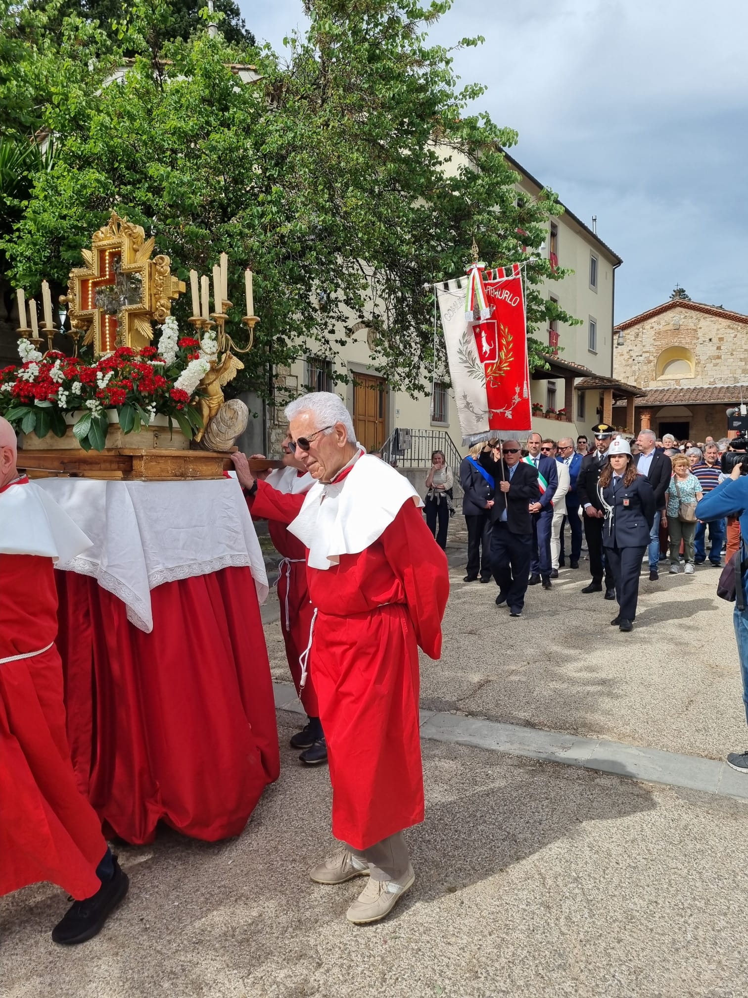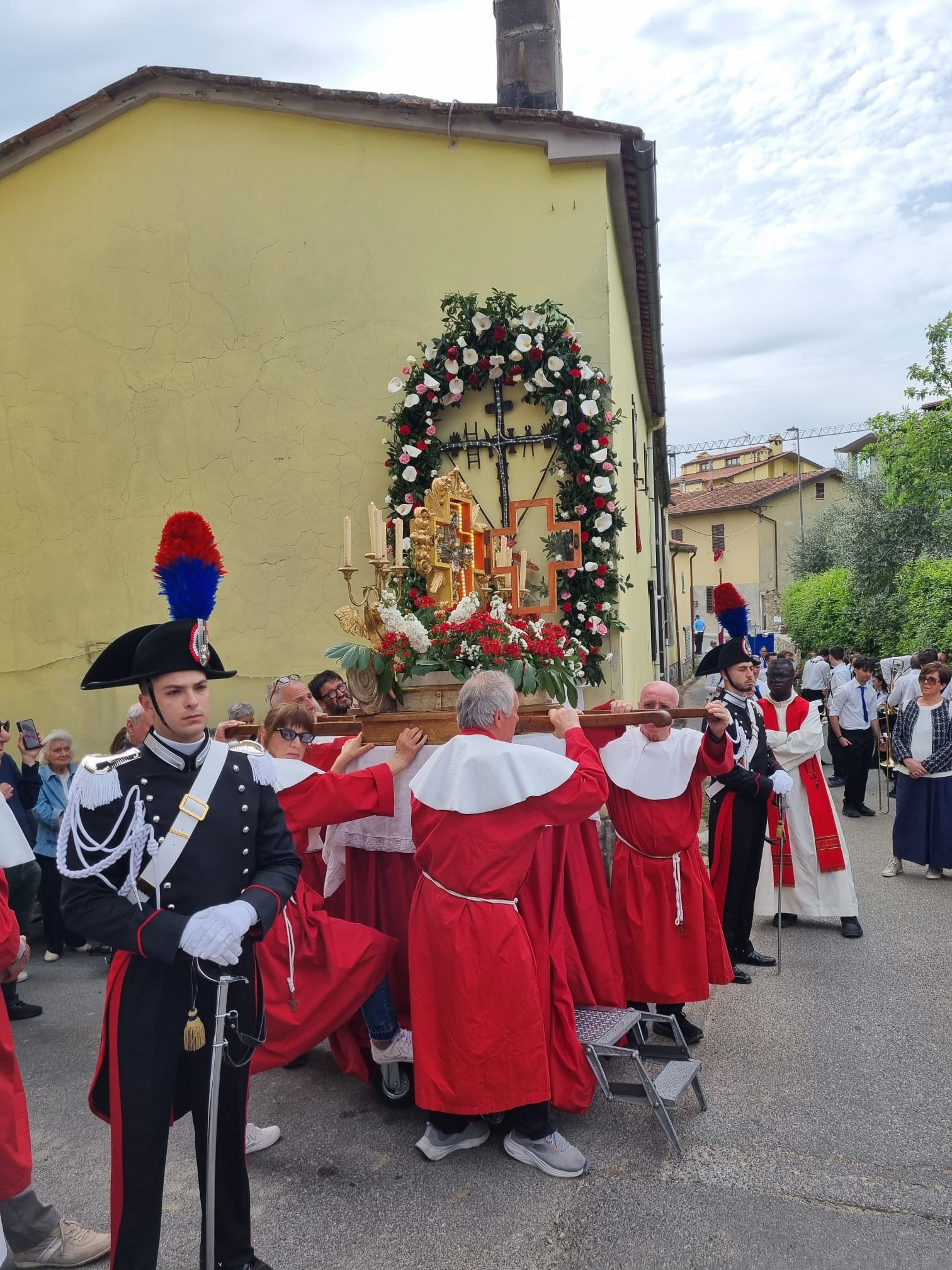 Montemurlo ha celebrato la festa patronale della Santa Croce. Alle ore 16 in punto di sabato 3 maggio la piccola croce astile in lamina d’argento, risalente al XIV, ha lasciato la teca sopra l’altare maggiore della pieve di San Giovanni Decollato alla Rocca dove di solito è custodita, ed è stata portata in processione scortata da due carabinieri della locale Tenenza in alta uniforme e dai custodi della Croce con i tradizionali abiti rossi e bianchi. La musica della Filarmonica “Giuseppe Verdi” ha accompagnato lungo tutto il percorso la processione, mentre le celebrazioni religiose sono state guidate dal neo parroco della parrocchia del Sacro Cuore, don Petre Iancu, alla sua prima celebrazione della festa patronale, accompagnato da don Jarek della parrocchia di Fornacelle, da don Gildas della chiesa di Bagnolo e da don Roland. A seguire il gonfalone del Comune di Montemurlo con il sindaco Simone Calamai, gli assessori della giunta Alberto Vignoli, Giuseppe Forastiero, Antonella Baiano, Alberto Fanti, dalla presidente del Consiglio comunale, Federica Palanghi dalla comandante della polizia municipale Enrica Cappelli e da quello della Tenenza dei Carabinieri, il capitano Quintino Preite. Tante le persone che hanno seguito la croce lungo il percorso che dalla piazza della Rocca è scesa in località Morecci ed ha attraversato le strade della vecchia Montemurlo fino al tabernacolo del Campo Santo, lungo, secondo la tradizione, del miracoloso ritrovamento dopo il trafugamento dalla Pieve di Rocca.