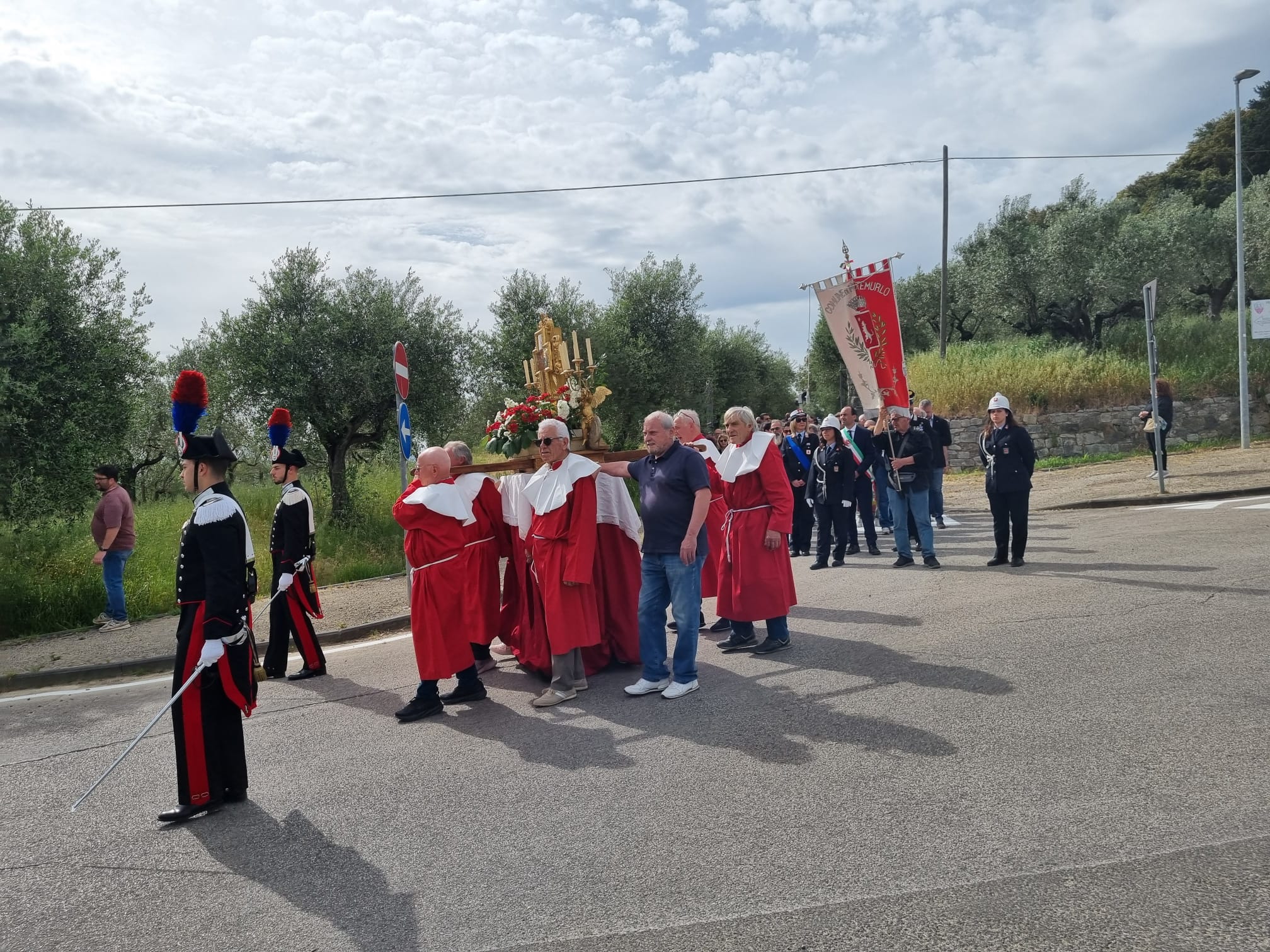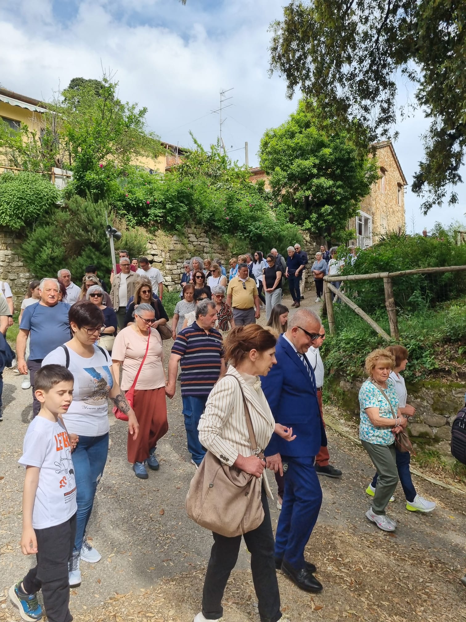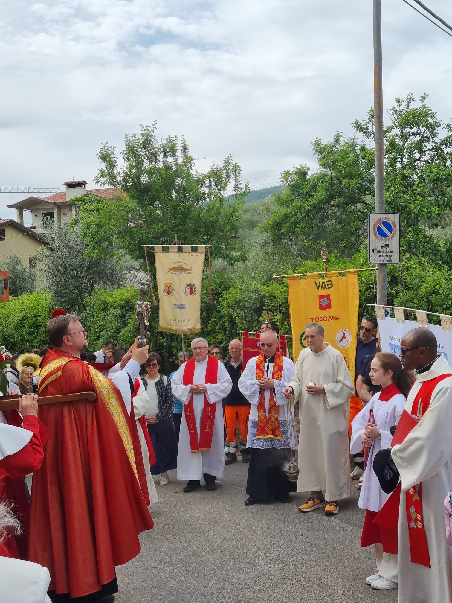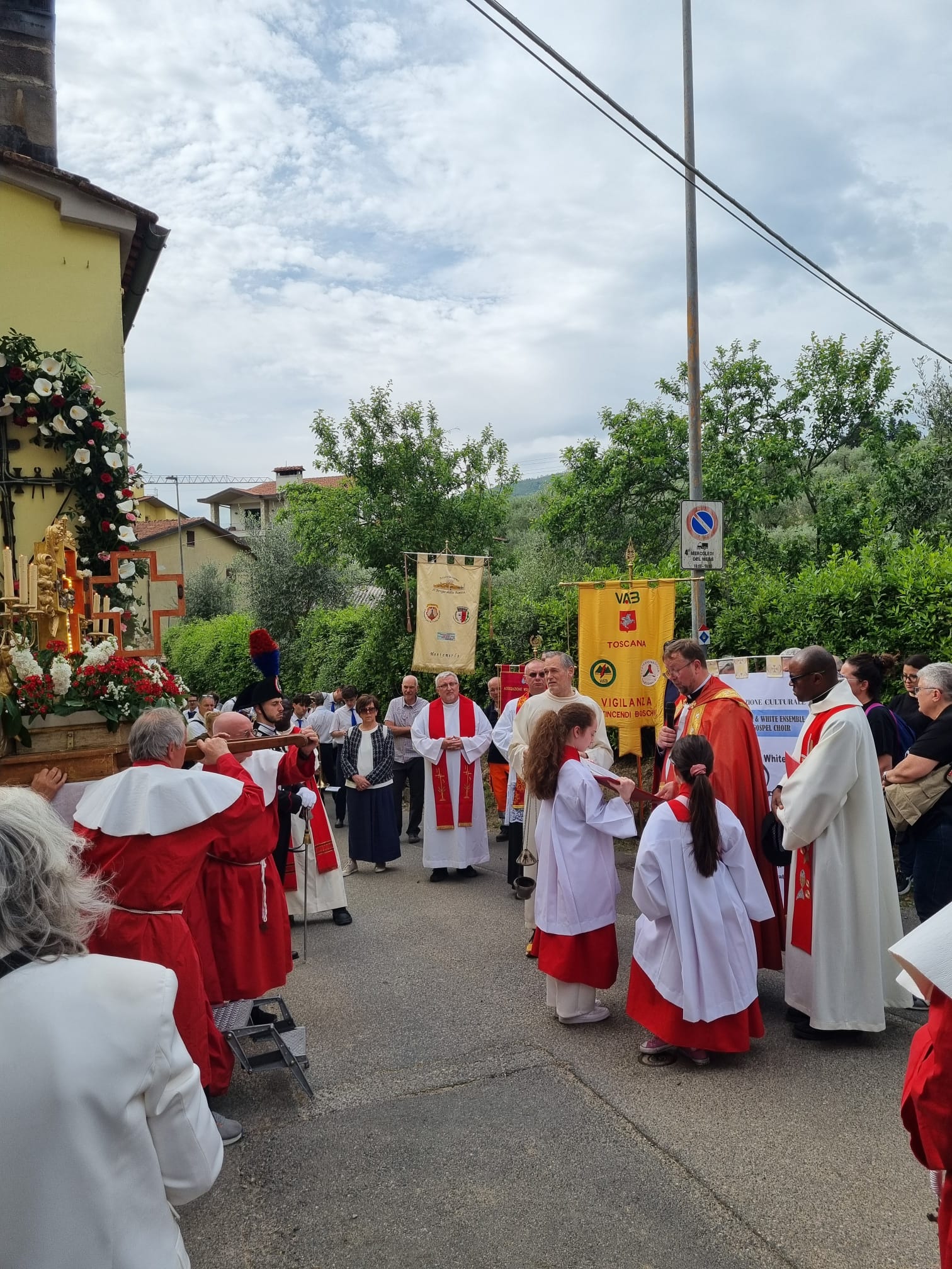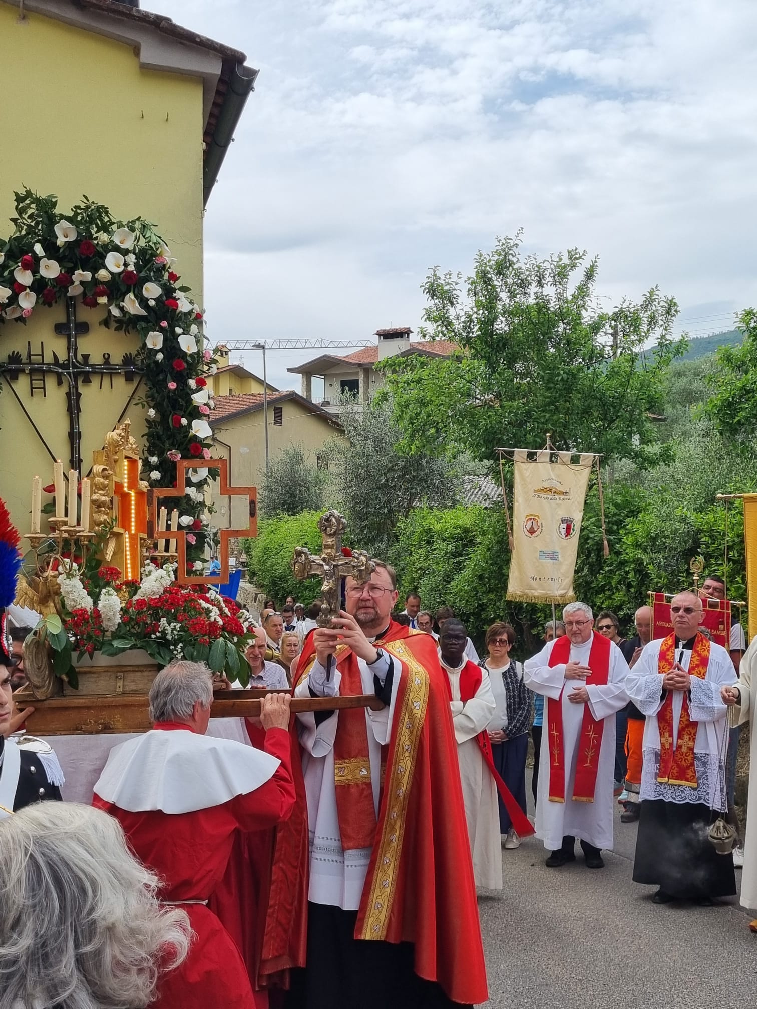 Montemurlo ha celebrato la festa patronale della Santa Croce. Alle ore 16 in punto di sabato 3 maggio la piccola croce astile in lamina d’argento, risalente al XIV, ha lasciato la teca sopra l’altare maggiore della pieve di San Giovanni Decollato alla Rocca dove di solito è custodita, ed è stata portata in processione scortata da due carabinieri della locale Tenenza in alta uniforme e dai custodi della Croce con i tradizionali abiti rossi e bianchi. La musica della Filarmonica “Giuseppe Verdi” ha accompagnato lungo tutto il percorso la processione, mentre le celebrazioni religiose sono state guidate dal neo parroco della parrocchia del Sacro Cuore, don Petre Iancu, alla sua prima celebrazione della festa patronale, accompagnato da don Jarek della parrocchia di Fornacelle, da don Gildas della chiesa di Bagnolo e da don Roland. A seguire il gonfalone del Comune di Montemurlo con il sindaco Simone Calamai, gli assessori della giunta Alberto Vignoli, Giuseppe Forastiero, Antonella Baiano, Alberto Fanti, dalla presidente del Consiglio comunale, Federica Palanghi dalla comandante della polizia municipale Enrica Cappelli e da quello della Tenenza dei Carabinieri, il capitano Quintino Preite. Tante le persone che hanno seguito la croce lungo il percorso che dalla piazza della Rocca è scesa in località Morecci ed ha attraversato le strade della vecchia Montemurlo fino al tabernacolo del Campo Santo, lungo, secondo la tradizione, del miracoloso ritrovamento dopo il trafugamento dalla Pieve di Rocca.