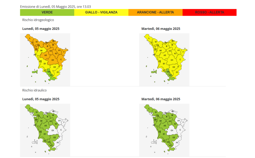 Mentre resta confermato fino alla mezzanotte di oggi, lunedì 5, l’allerta arancione per rischio idrogeologico e idraulico del reticolo minore e per temporali forti nelle aree settentrionali e in quelle interne, per la giornata di domani, martedì 6 maggio, la Sala operativa della protezione civile regionale ha emesso un codice giallo che riguarderà quasi tutta la Toscana.