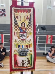 «Nei bozzetti elaborati dai ragazzi si trovano i simboli classici di questo genere di opere. Ci sono gli stemmi delle istituzioni, il Comune, la Regione, il Gruppo storico, la corona, che ritroviamo anche nel gonfalone del Comune e che ricorda i merli del castello della Rocca. Inoltre, ci sono i colori dei sette rioni montemurlesi che si sfideranno nei Giochi d’altri tempi e in alto c’è la Vergine che protegge tutti. – spiega la professoressa Panebianco– In fondo allo stendardo, infine, si trova la riproduzione di un antico gioco medievale che veniva fatto recuperando i cerchi metallici delle botti. I ragazzi infatti hanno fatto una specifica ricerca sui giochi del passato».