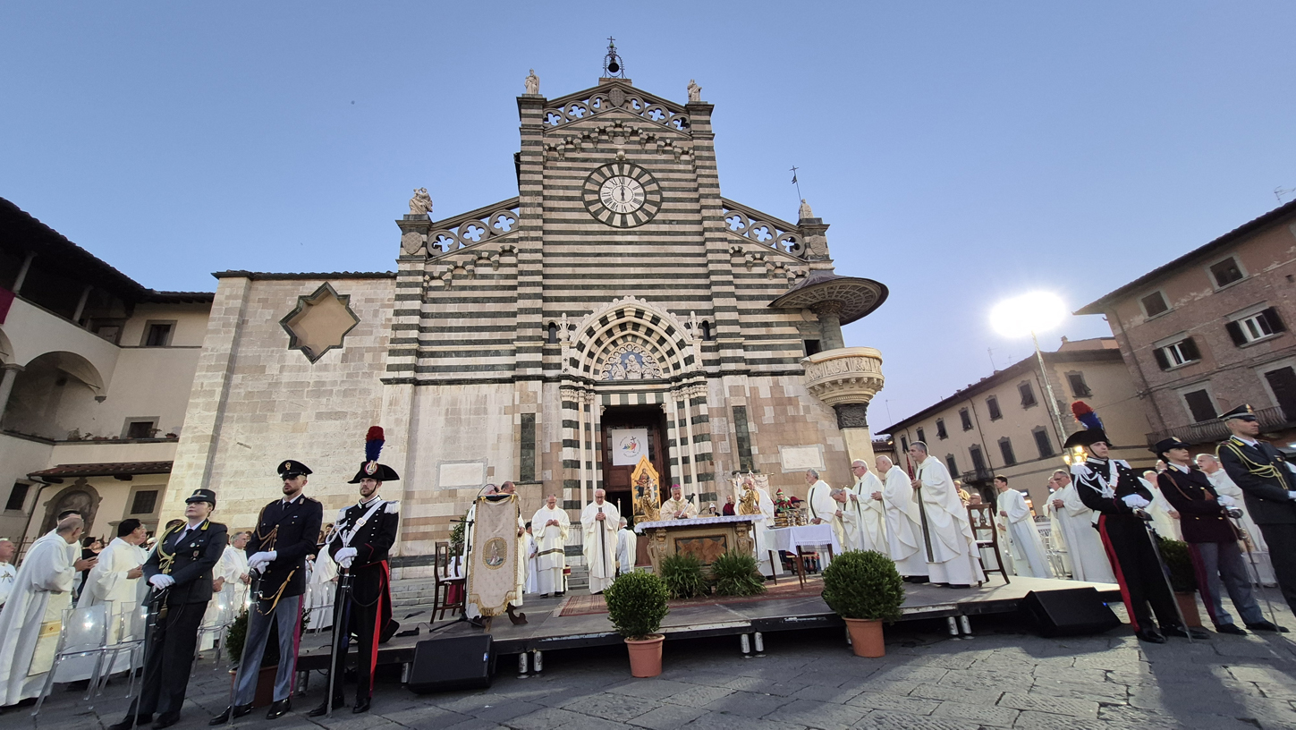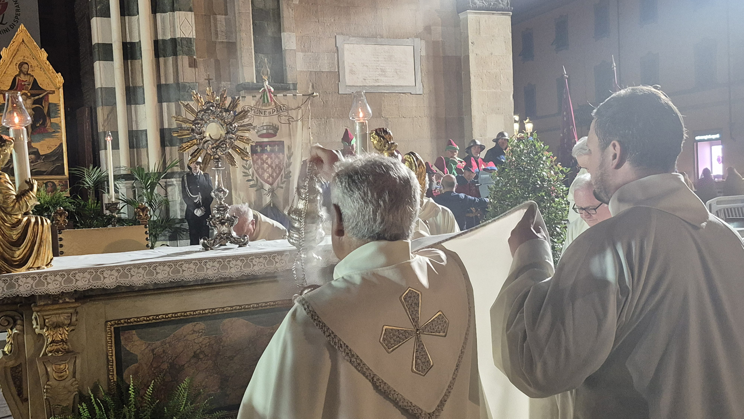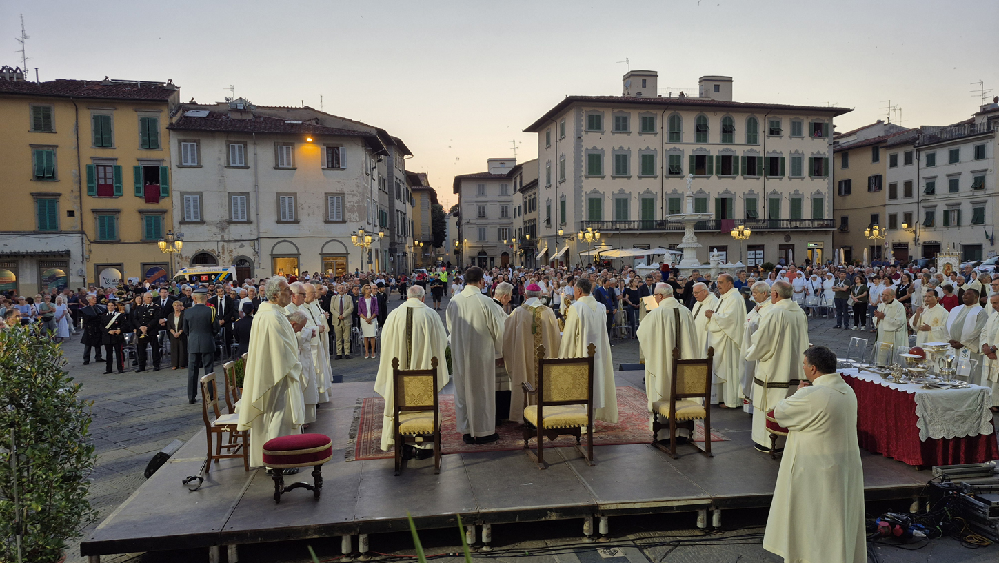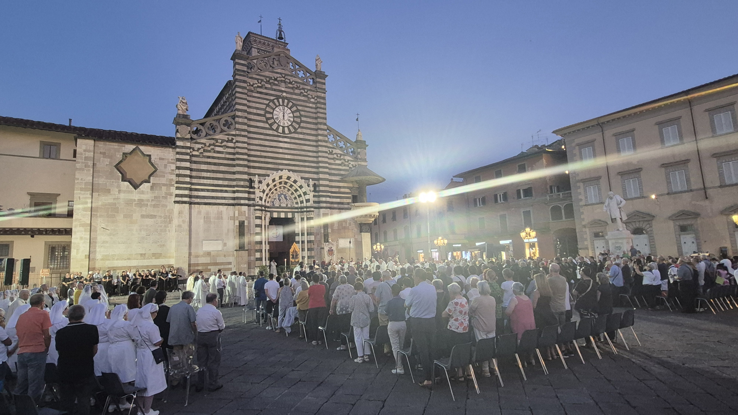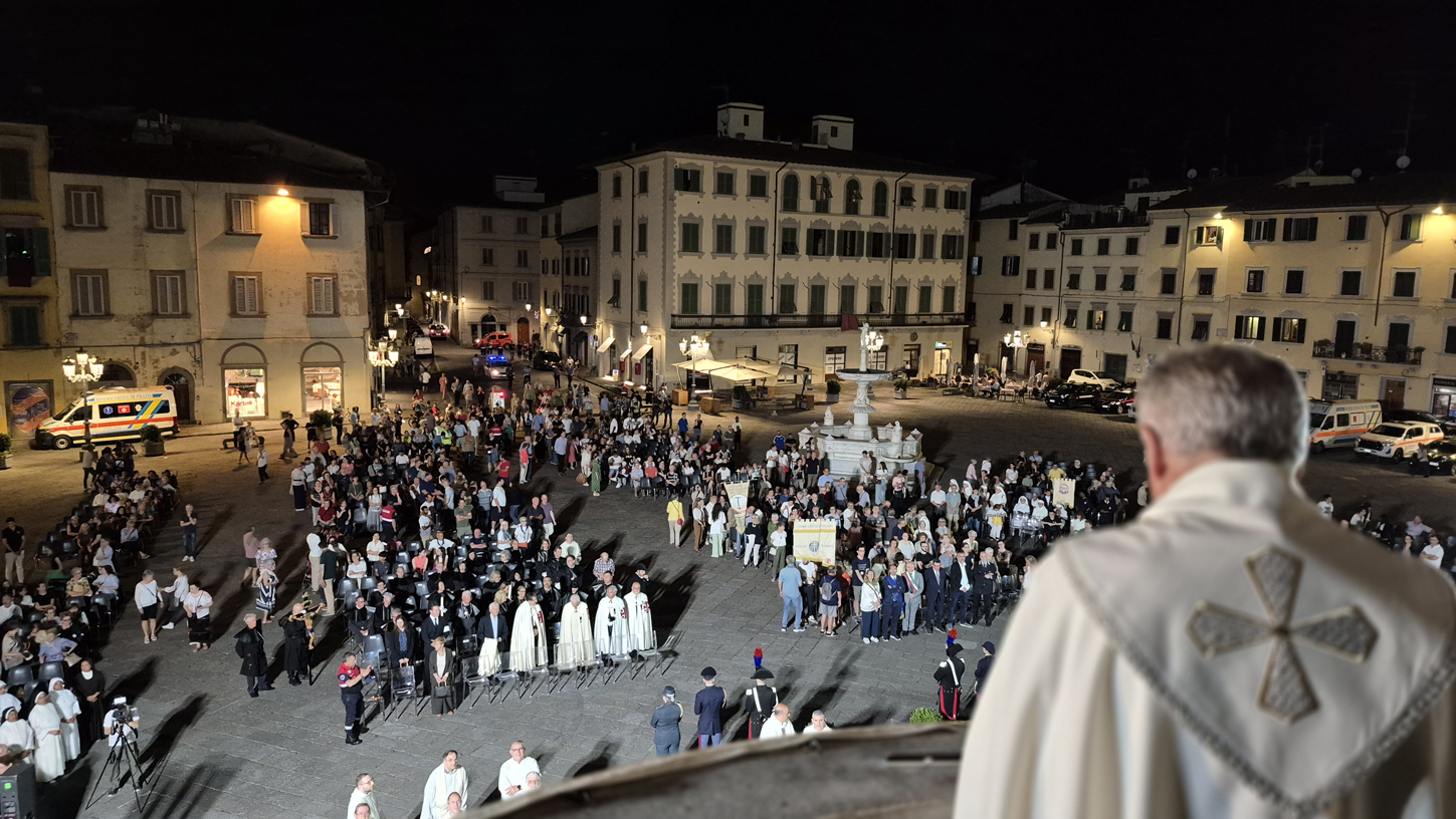 Le parole del Vescovo. Arrivato in cattedrale monsignor Nerbini è salito sul pulpito di Donatello dove dall’alto ha impartito la benedizione eucaristica sui presenti. Prima ha pronunciato una omelia nella quale ha ricordato il recente pellegrinaggio in Terra Santa compiuto insieme ai vescovi della Toscana, il cui ritorno in Italia è stato reso complicato dall’attacco di Israele all’Iran. «Ho visto con i miei occhi la settimana scorsa la guerra che dovrebbe risolvere i problemi di convivenza e che ogni giorno per la follia di protagonisti ciechi spinge un po’ di più il mondo sul ciglio del baratro di un vero e proprio conclamato conflitto nucleare – ha detto il Vescovo –. E quante sono le guerre accese! Ed intorno a noi, al sicuro dalla guerra, violenza, insicurezza, diffidenza, divisioni, solitudini sono in crescita. Lo stesso cosiddetto benessere a volte diventa un malessere comunitario e personale, pieno di paure e diffidenze». In questi giorni monsignor Nerbini sta visitando i grest parrocchiali, partecipati da moltissimi bambini e bambine: «è stato bellissimo ieri mattina sentire un bimbo affermare con tutto il candore e la convinzione dell’innocenza dei piccoli: “Noi possiamo cambiare il mondo!” Sì, è una verità indiscutibile, ma relativa. Possiamo, ma non da soli. L’uomo da solo resta il malato di sempre nell’anima e nel cuore, nei desideri, e nella volontà. C’è bisogno di un salto di qualità, il passaggio dalla natura umana ferita dal peccato al mondo della grazia di Dio».