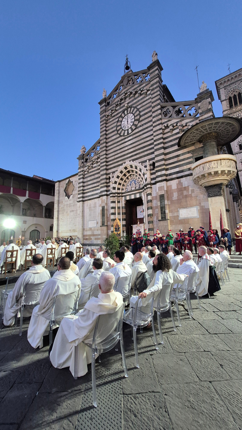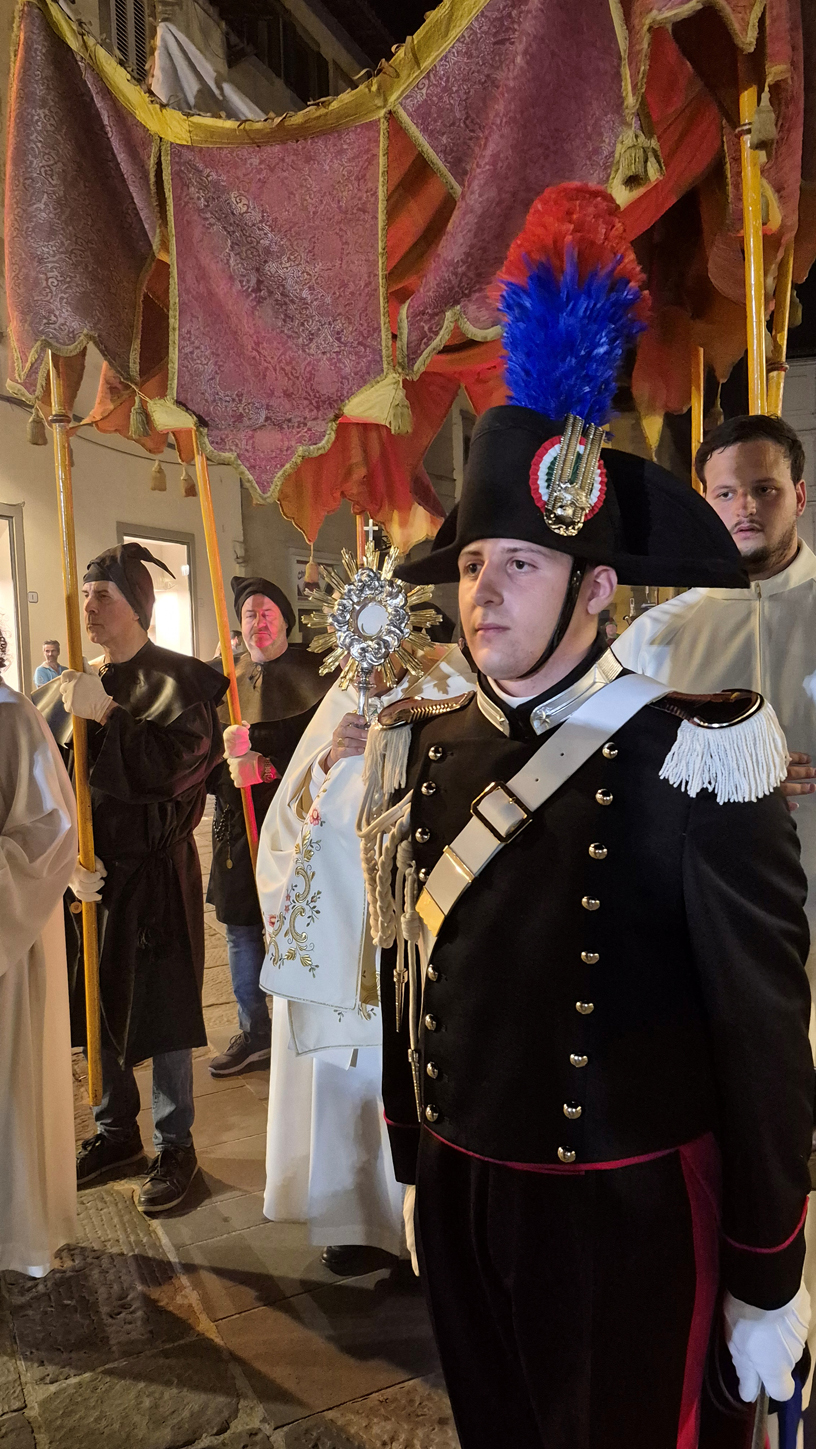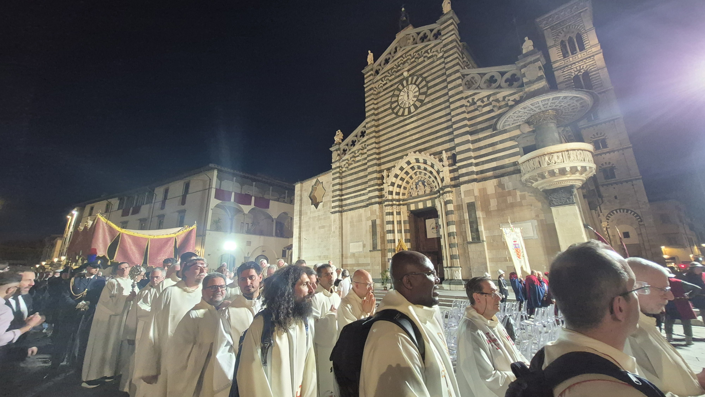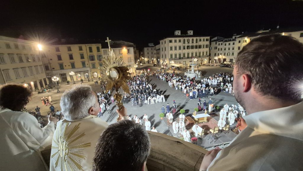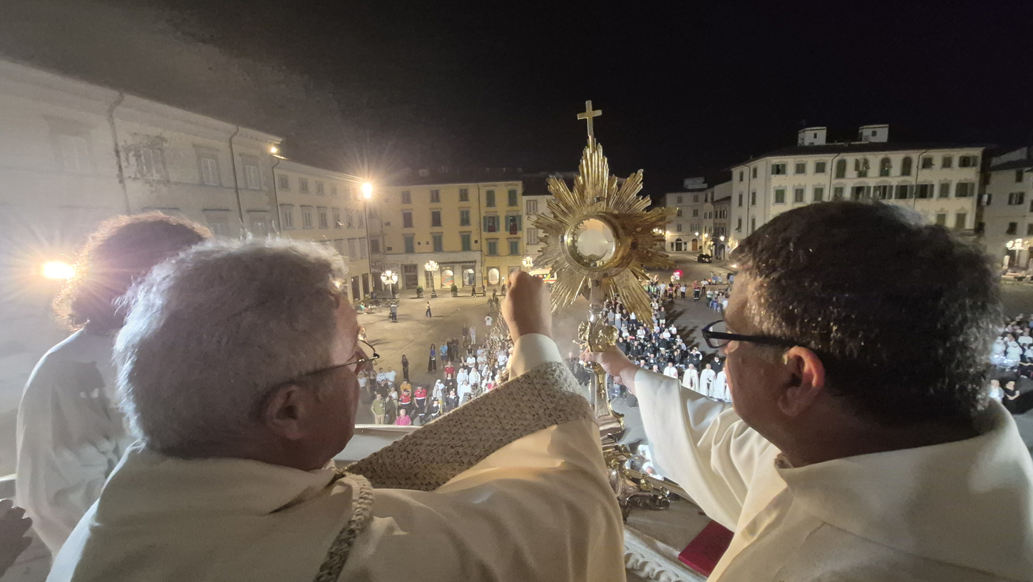 Le parole del Vescovo. Arrivato in cattedrale monsignor Nerbini è salito sul pulpito di Donatello dove dall’alto ha impartito la benedizione eucaristica sui presenti. Prima ha pronunciato una omelia nella quale ha ricordato il recente pellegrinaggio in Terra Santa compiuto insieme ai vescovi della Toscana, il cui ritorno in Italia è stato reso complicato dall’attacco di Israele all’Iran. «Ho visto con i miei occhi la settimana scorsa la guerra che dovrebbe risolvere i problemi di convivenza e che ogni giorno per la follia di protagonisti ciechi spinge un po’ di più il mondo sul ciglio del baratro di un vero e proprio conclamato conflitto nucleare – ha detto il Vescovo –. E quante sono le guerre accese! Ed intorno a noi, al sicuro dalla guerra, violenza, insicurezza, diffidenza, divisioni, solitudini sono in crescita. Lo stesso cosiddetto benessere a volte diventa un malessere comunitario e personale, pieno di paure e diffidenze». In questi giorni monsignor Nerbini sta visitando i grest parrocchiali, partecipati da moltissimi bambini e bambine: «è stato bellissimo ieri mattina sentire un bimbo affermare con tutto il candore e la convinzione dell’innocenza dei piccoli: “Noi possiamo cambiare il mondo!” Sì, è una verità indiscutibile, ma relativa. Possiamo, ma non da soli. L’uomo da solo resta il malato di sempre nell’anima e nel cuore, nei desideri, e nella volontà. C’è bisogno di un salto di qualità, il passaggio dalla natura umana ferita dal peccato al mondo della grazia di Dio».