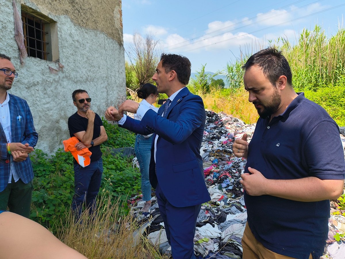 LA COMMISSIONE A CARMIGNANO – Un sistema di controlli di livello superiore; disposizione legislative che consentano di classificare gli scarti del “fast fashion” per il loro riutilizzo; forme di più stretta collaborazione tra istituzioni locali e organi statali; un “patto” con le rappresentanze, anche diplomatiche, dell’imprenditoria del “pronto moda”: sono le richieste e le sollecitazioni che il sindaco Edoardo Prestanti, e il suo vice nonchè assessore all’Ambiente Federico Migaldi (presente anche il responsabile del settore Ambiente ing. Stefano Venturi), hanno rivolto ai componenti della Commissione parlamentare d’inchiesta “sulle attività illecite connesse al ciclo dei rifiuti e su altri illeciti ambientali e agroalimentari”, accompagnati, presidente on. Jacopo Morrone in testa, in due luoghi “simbolo” della presenza di rifiuti tessili abbandonati e di “sacchi neri”: un casolare, a Seano, in prossimità della Statale, un’area in via del Granaio.