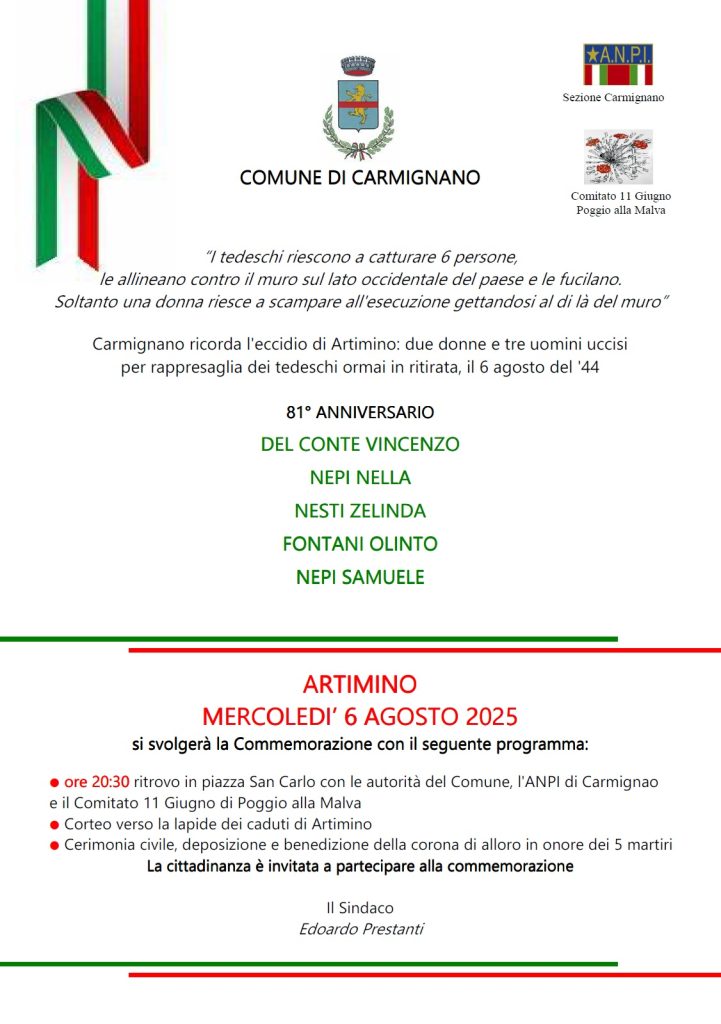 Una cerimonia – con Comune di Carmignano, Anpi, Circolo Arci 11 giugno – ricorderà l’eccidio a partire dalle ore 20,30. Il ritrovo è in piazza San Carlo da dove i partecipanti andranno verso la lapide in memoria dei caduti, dove si svolgerà la cerimonia ufficiale, con deposizione e benedizione di una corona d’alloro.