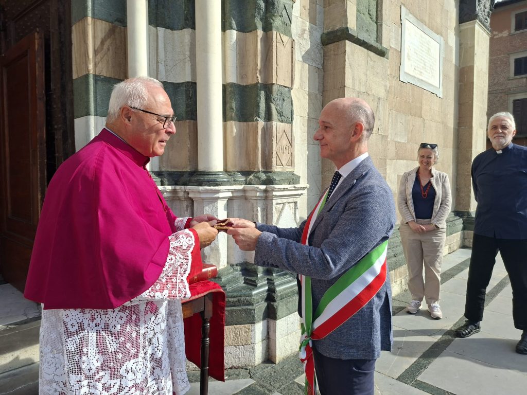La Sacra Cintola di Maria, simbolo religioso e civile di Prato, è da oggi esposta alla venerazione dei fedeli in cattedrale fino all’8 settembre, la festa della città. Il sub commissario Davide Lo Castro ha consegnato nelle mani del vicario generale monsignor Daniele Scaccini le due chiavi di proprietà del Comune, necessarie per l’apertura del cofano dell’altare, dove da secoli è custodita la preziosa reliquia. La terza chiave invece è posseduta dalla Diocesi.