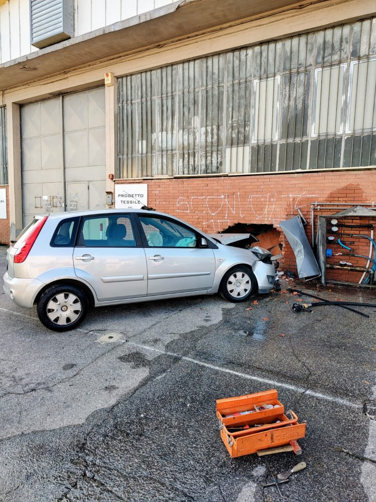 Scontro tra auto, una sfonda il muro di un’azienda tessile e causa una fuga di gas