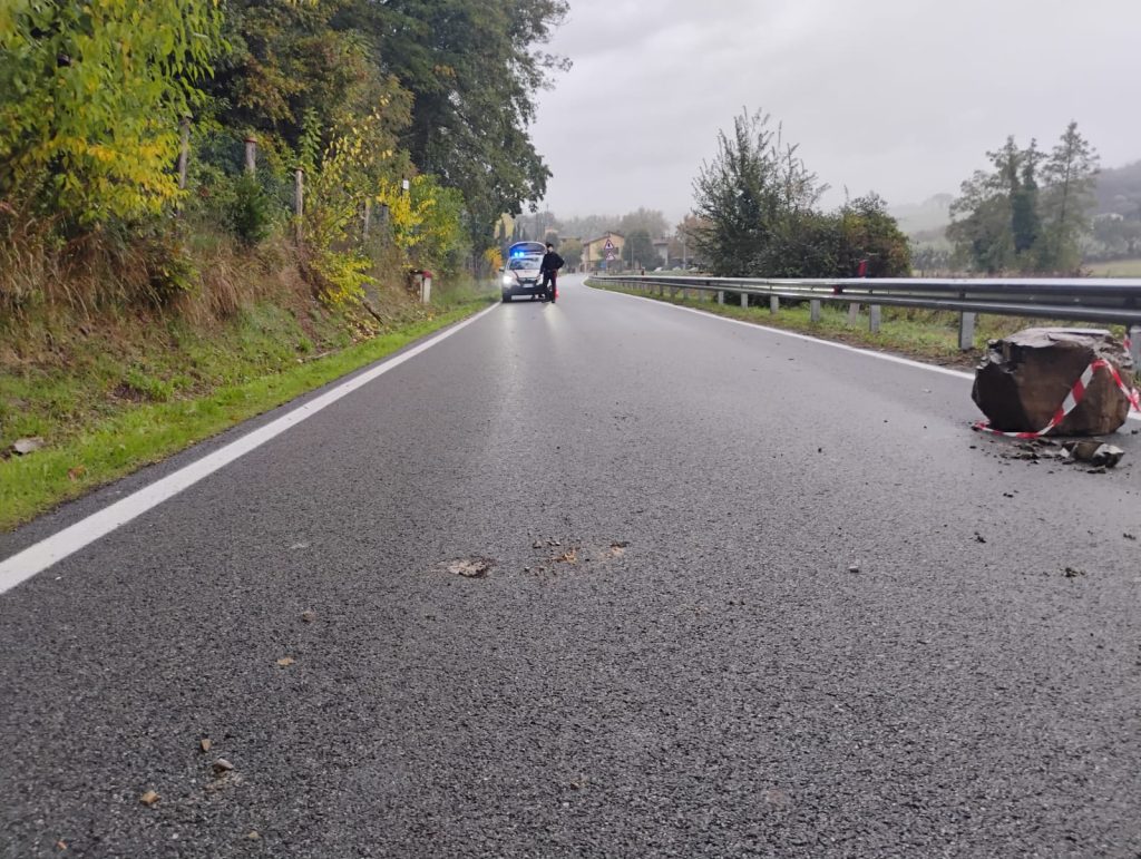 In corso le attività di indagine sul masso, che dovrebbe essere caduto da un terrapieno adiacente la strada.
