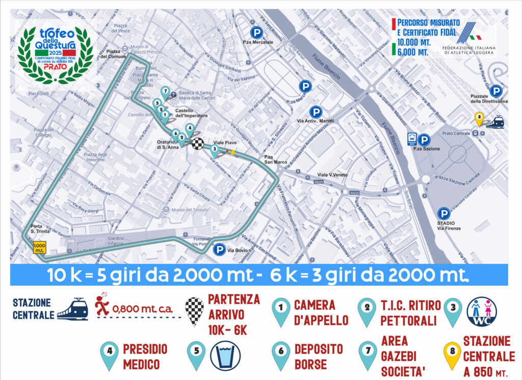Il circuito di 2 km sarà cittadino e sarà da ripetere cinque volte, con partenza e arrivo in viale Piave, di fronte al maestoso Castello dell’Imperatore. Il tracciato attraverserà i luoghi simbolo della città: Piazza San Marco, via Pomeria, la Porta Santa Trinita, Piazza del Comune con la celebre fontana del Bacchino, e ancora Piazza Sant’Antonino e via San Bonaventura, in un continuo intreccio tra storia e modernità. L’evento, promosso dalla Fidal Nazionale in collaborazione con le realtà sportive pratesi, rappresenta un riconoscimento importante per una città che da anni investe con passione nell’atletica e nel podismo.