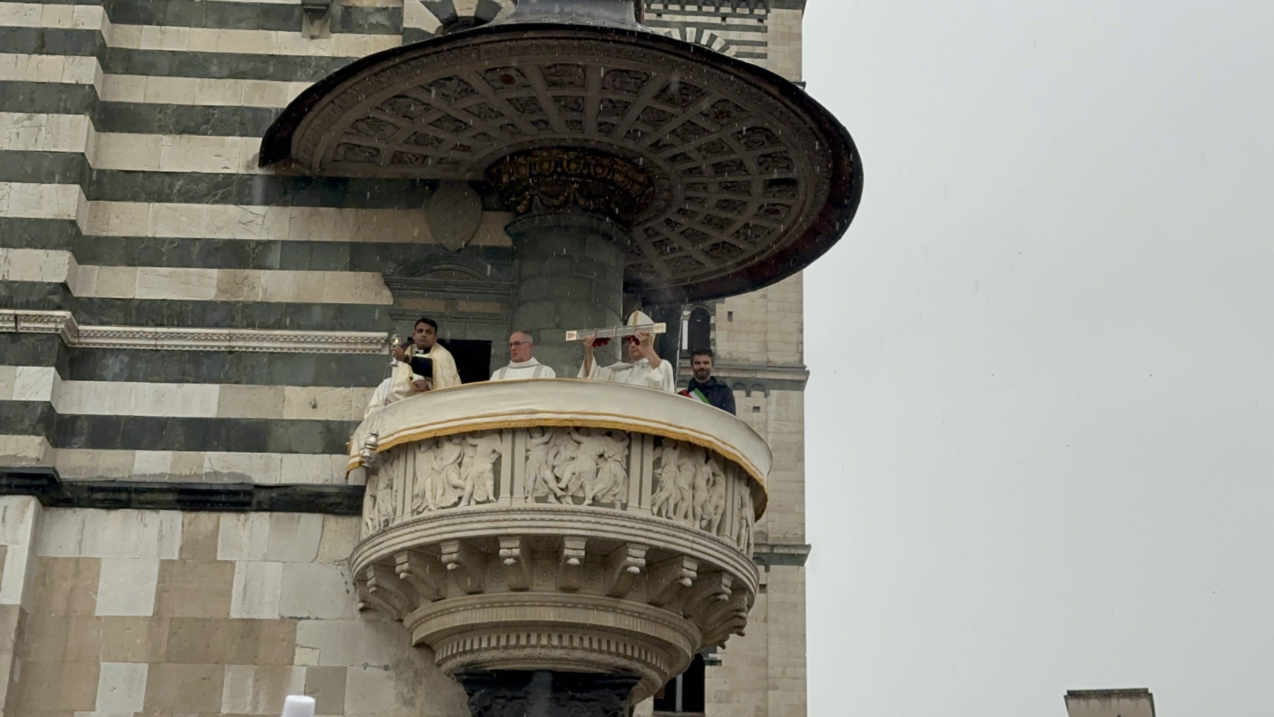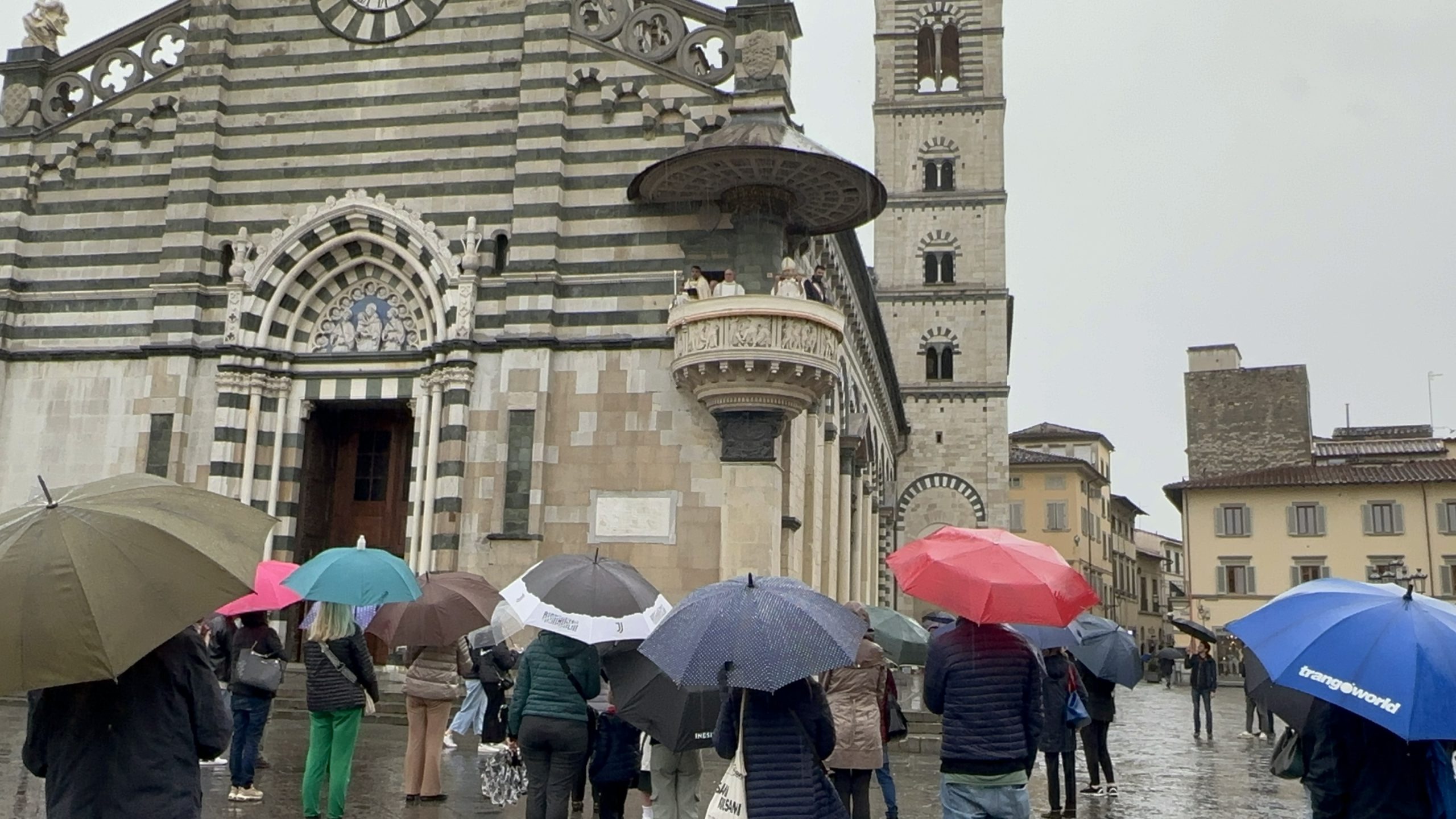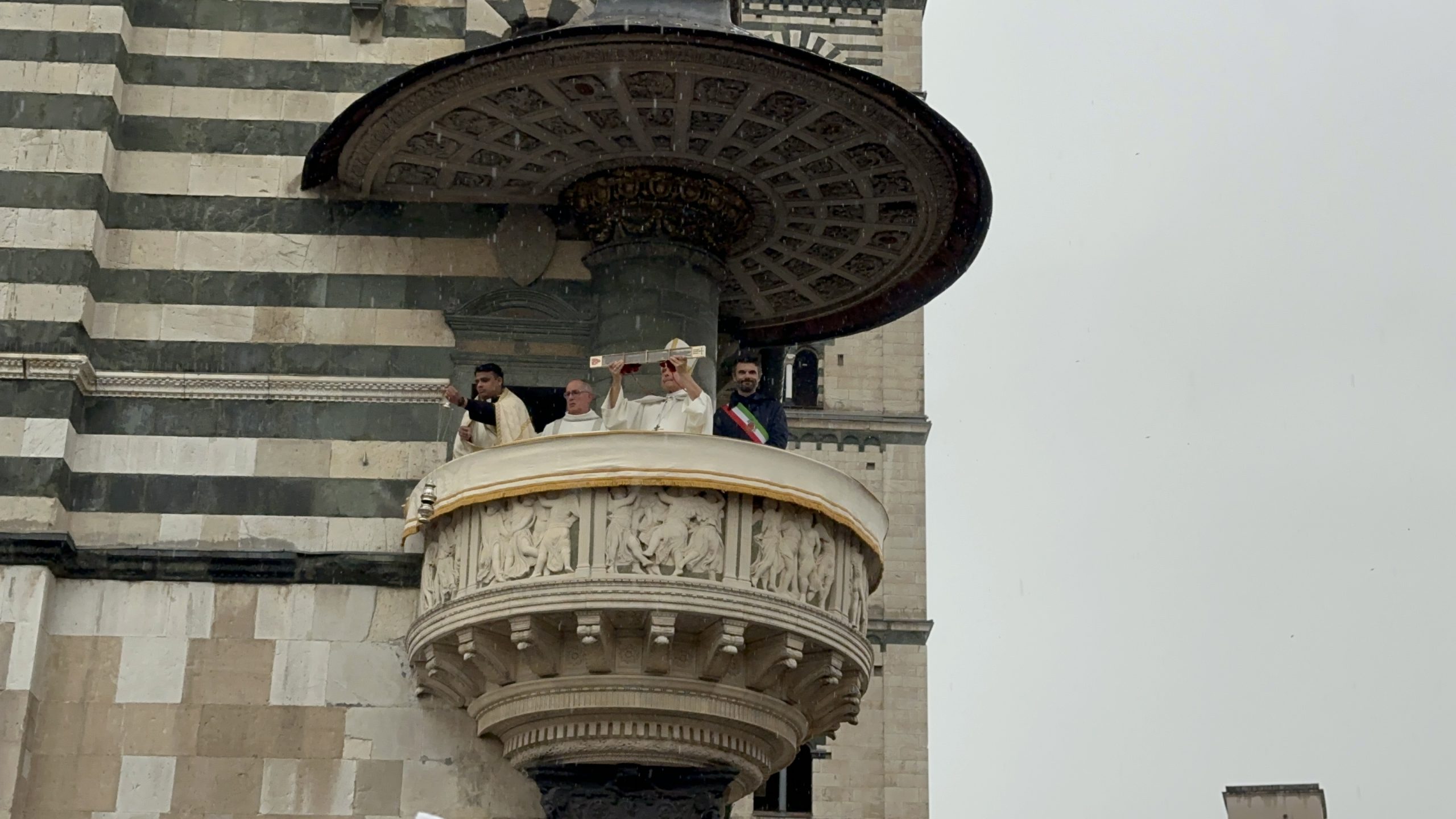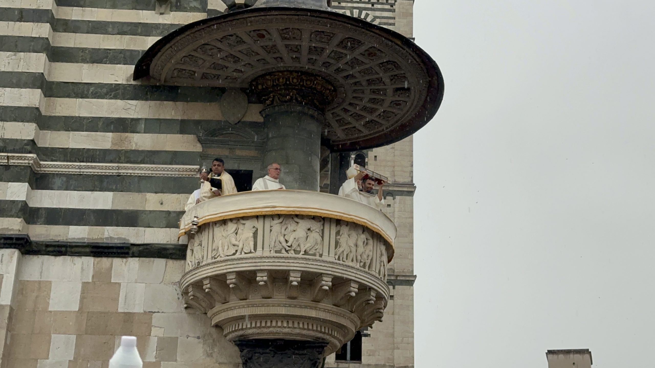 La reliquia mariana è stata mostrata per tre volte ai fedeli presenti, all’interno della Cattedrale dalla Loggia del Ghirlandaio e all’esterno dal pulpito di Donatello. A causa della forte pioggia, la maggior parte dei fedeli ha preferito assistere alla cerimonia dall’interno della Cattedrale, ma qualcuno si è radunato anche in Piazza del Duomo, munito di ombrello.
