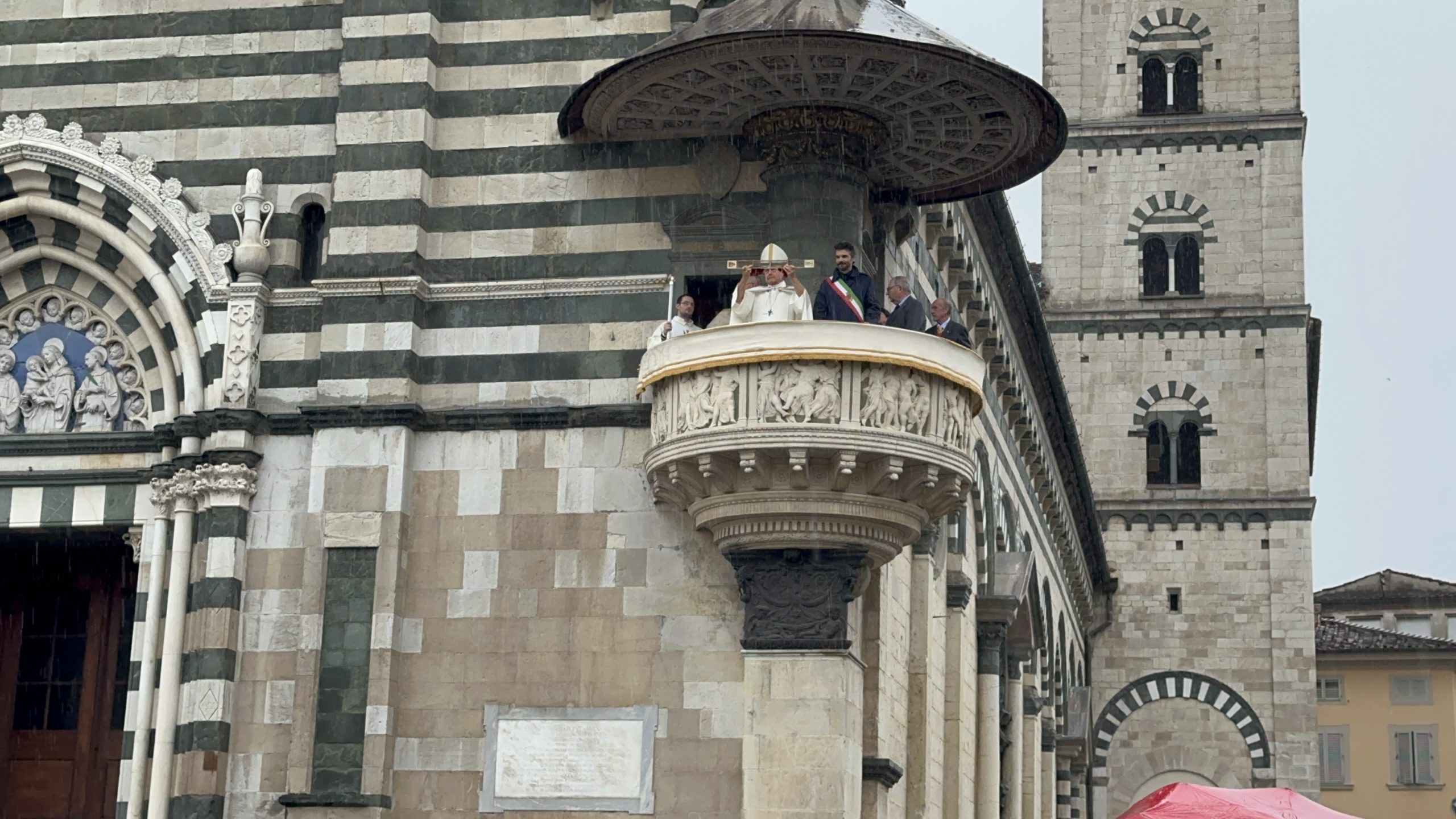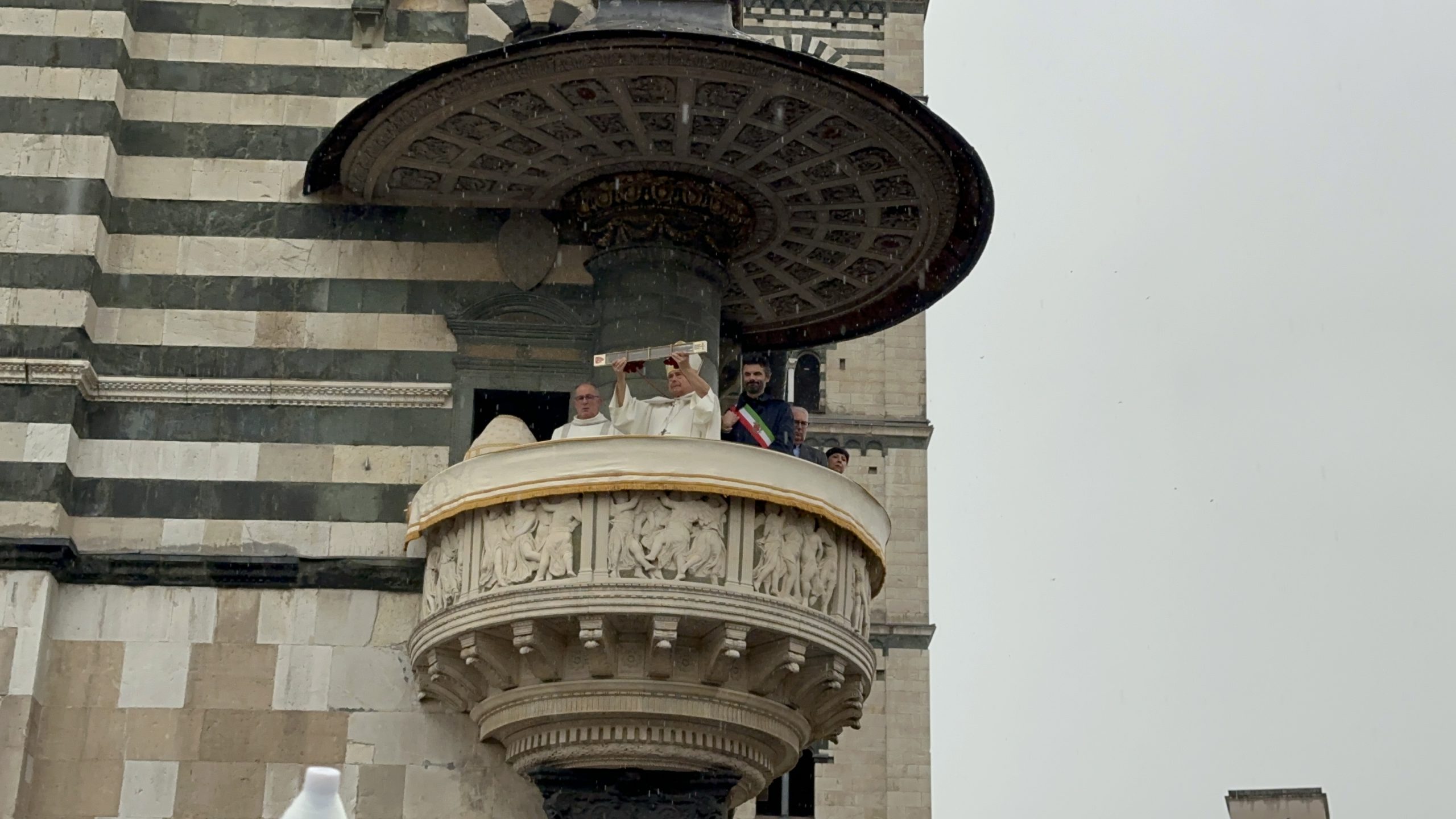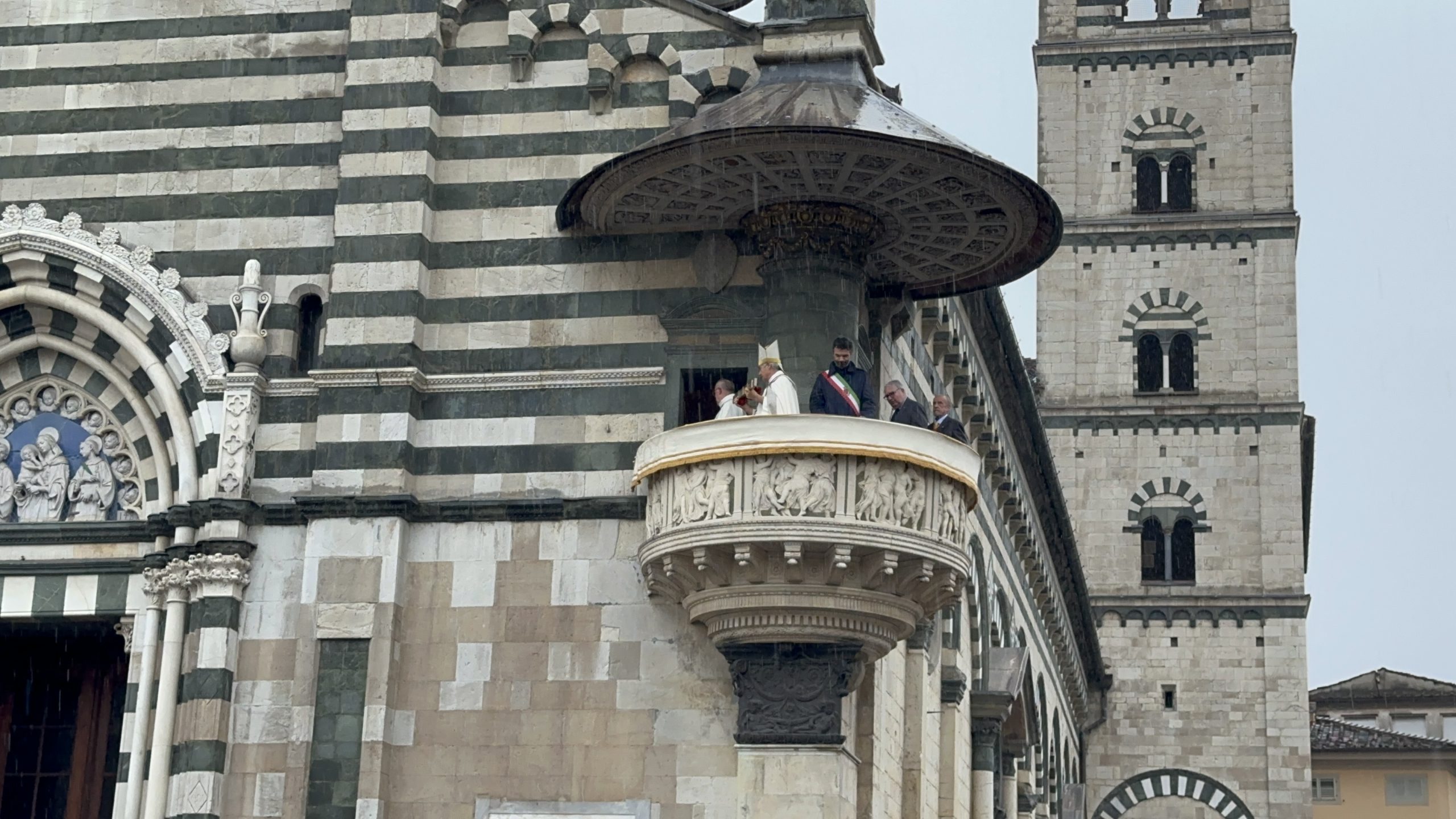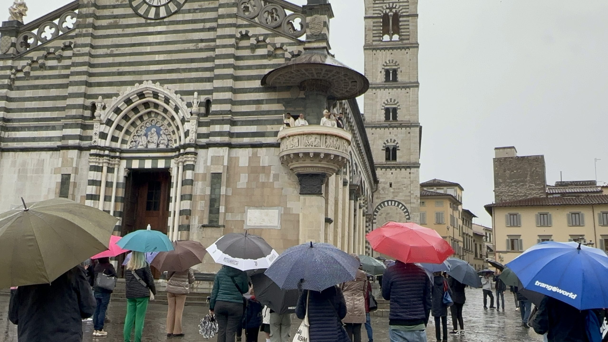 La reliquia mariana è stata mostrata per tre volte ai fedeli presenti, all’interno della Cattedrale dalla Loggia del Ghirlandaio e all’esterno dal pulpito di Donatello. A causa della forte pioggia, la maggior parte dei fedeli ha preferito assistere alla cerimonia dall’interno della Cattedrale, ma qualcuno si è radunato anche in Piazza del Duomo, munito di ombrello.