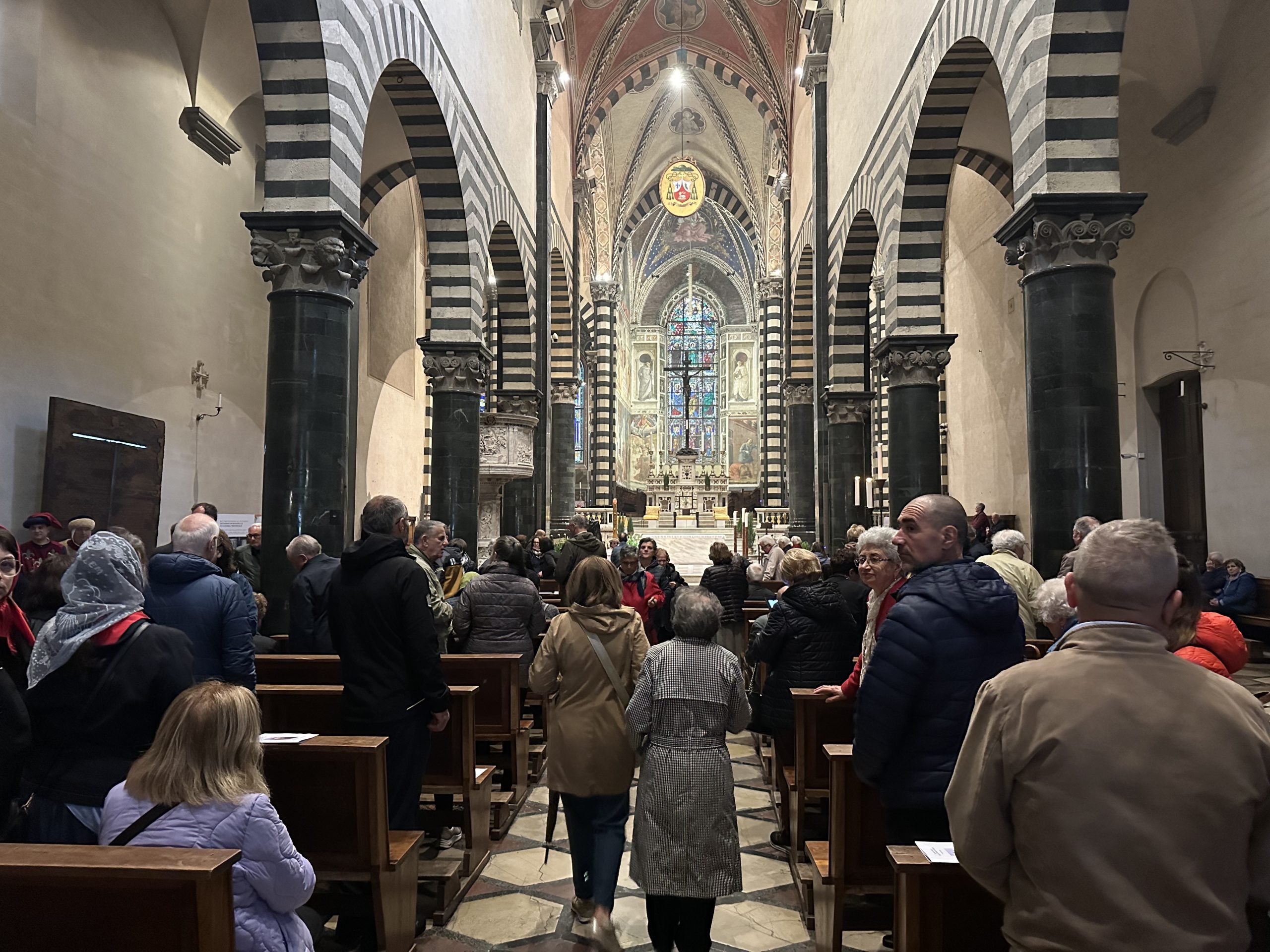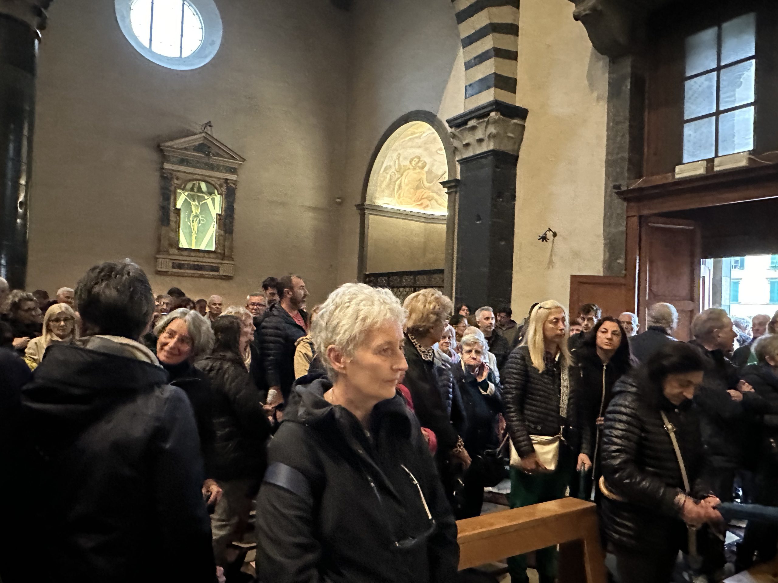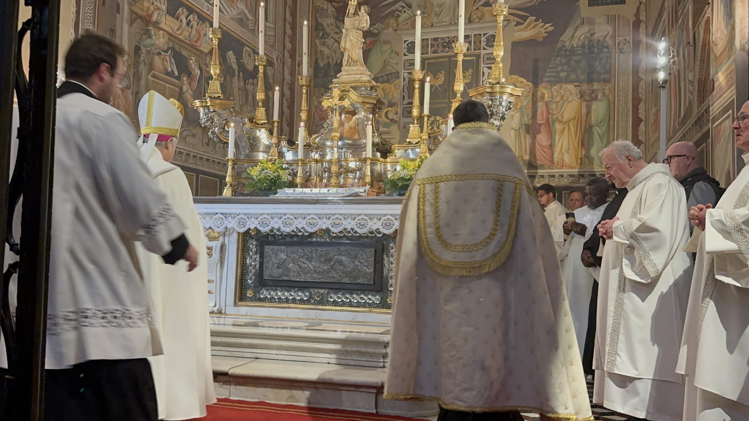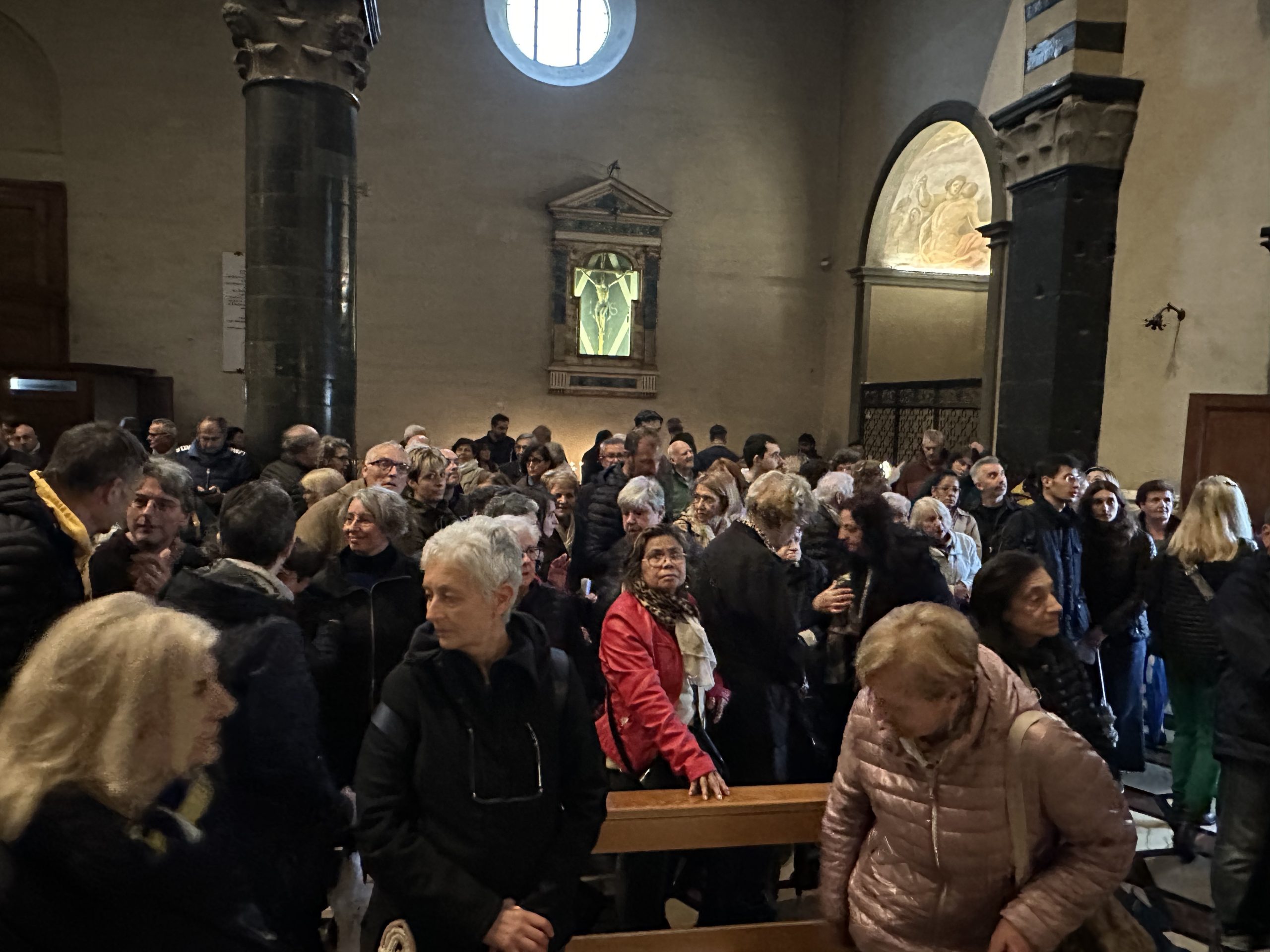 La reliquia mariana è stata mostrata per tre volte ai fedeli presenti, all’interno della Cattedrale dalla Loggia del Ghirlandaio e all’esterno dal pulpito di Donatello. A causa della forte pioggia, la maggior parte dei fedeli ha preferito assistere alla cerimonia dall’interno della Cattedrale, ma qualcuno si è radunato anche in Piazza del Duomo, munito di ombrello.